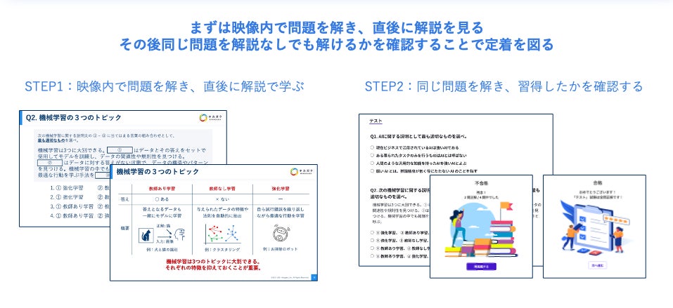 アセスメントで不正解だった箇所に類似した問題演習と解説動画を提供