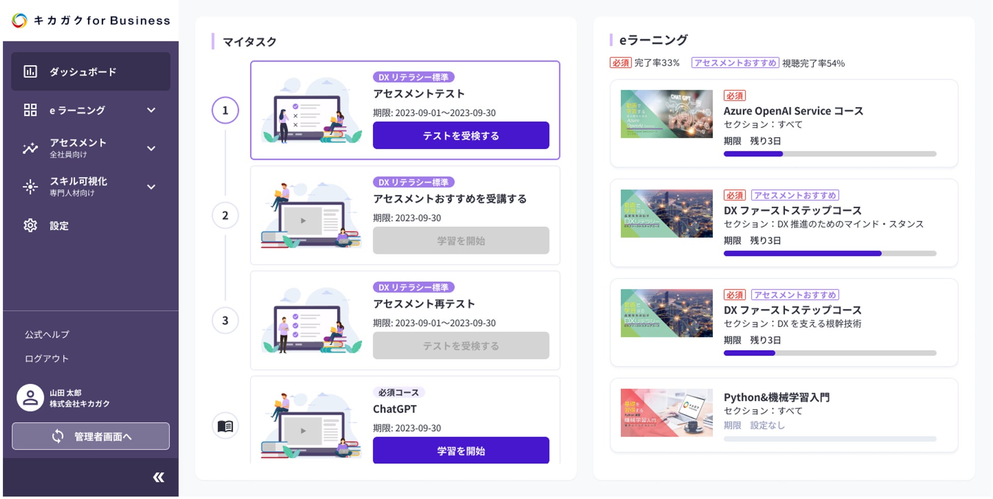 人工知能・機械学習を含めた先端技術に関する教育事業を展開する株式会社キカガク(本社:東京都渋谷区、代表取締役社長:大崎 将寛)は、当社が提供する DX スキル可視化ツール「デジタルスキル標準」準拠アセスメントの機能を大幅に強化し、本日よりアップデートしたサービスの提供を開始いたしました。