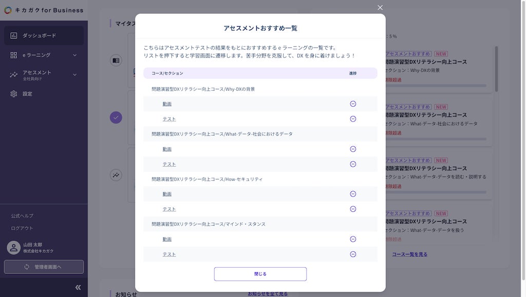 アセスメント結果に基づき、個々のユーザーの弱点に特化した eラーニング講座を自動的にレコメンド