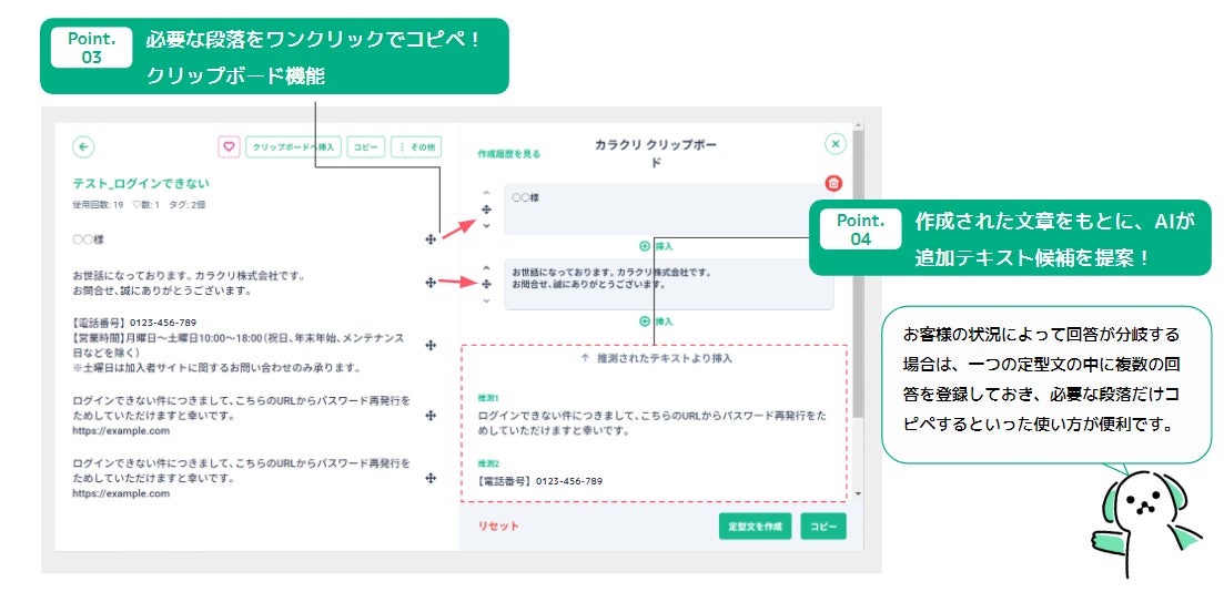 「KARAKURI assist」は、回答の定型文(テンプレート)の共有・ナレッジ化を簡単に行えます。テンシャルではベテランオペレーターなどが作成したメール・チャットの定型文をチーム内で共有し、新人の方でも最低限の商品知識があれば自信をもって回答できるようになりました。またテンプレート内の文章を段落ごとに活用できるクリップボード機能により、ご購入者さまの状況に合わせた文章をコピー&ペーストで手軽に作成でき、お客様対応件数の向上を実現しております。
