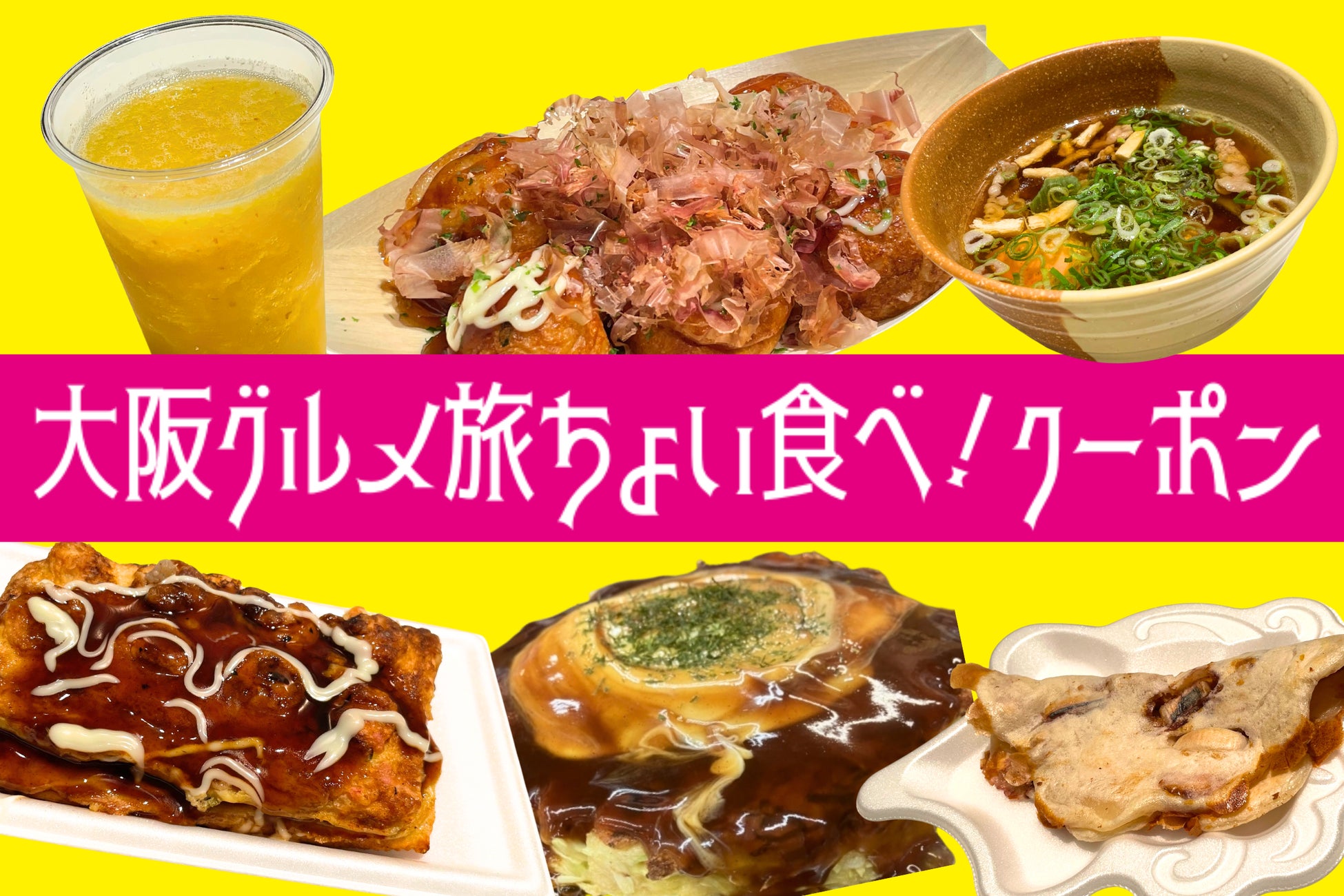 大阪王道グルメをちょっとずついろいろ楽しみたい方必見のお得なクーポンです。たこ焼き、お好み焼き、肉吸い、ミックスジュースなど、12 枚つづりのクーボンで、1 メニューあたり 2~5 枚で引き換えることができます。