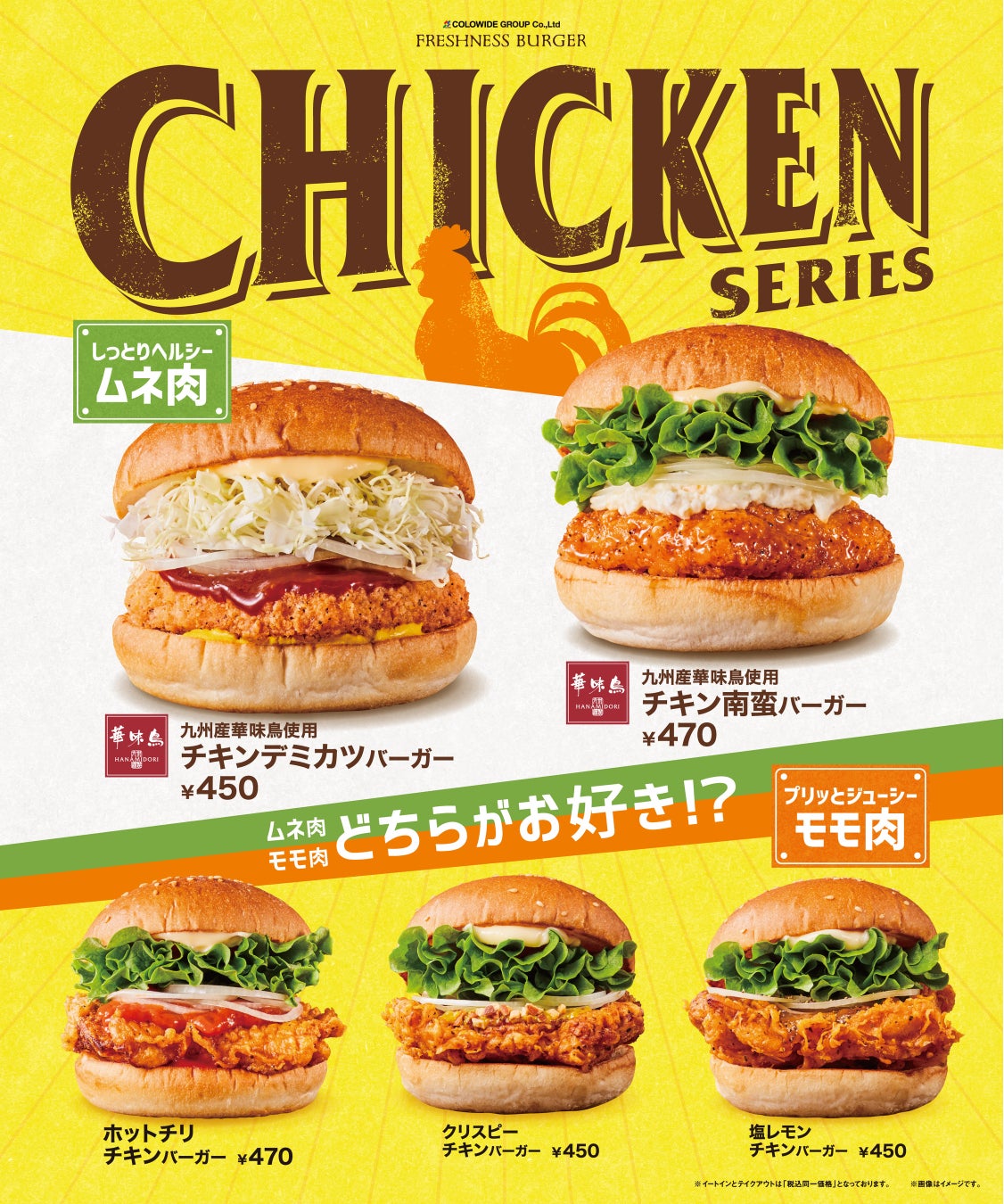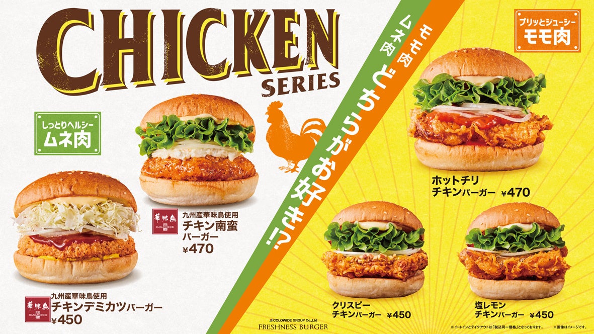 コロワイドグループの株式会社フレッシュネス(代表取締役社長:齋藤 健太朗/本社:神奈川県横浜市西区)は、2022年4月13日(水)より、ハンバーガーチェーン「フレッシュネスバーガー」にてムネ肉・モモ肉を使用した5種類のハンバーガーが楽しめるチキンシリーズキャンペーンを開催いたします。