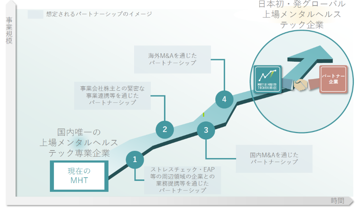 本パートナーシップは、当社IR資料上で提唱している「柔軟な”パートナーシップ”の活用により目指す成長のイメージ」内の「事業会社株主との緊密な事業連携等を通じたパートナーシップ」戦略の一環です。今後も、柔軟な”パートナーシップ”を通じて健康経営や人的資本経営等の概念に包含される職場環境の改善にパートナー企業と共に真摯に取り組み『国内唯一の上場メンタルヘルステック企業』から『日本初・発 グローバル上場メンタルヘルステック企業』を目指し成長を加速していきます。