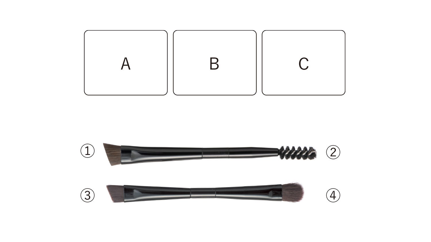 2.薄いほうのカラーBで眉全体の形を描く。斜めカットのブラシ(③)、ラウンドタイプのブラシ(④)どちらでもOK。