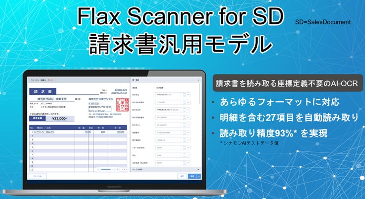 シナモンAI、電帳法とインボイス制度に対応した請求書汎用AI-OCR「Flax Scanner for SD 請求書汎用モデル」を11月6日より販売