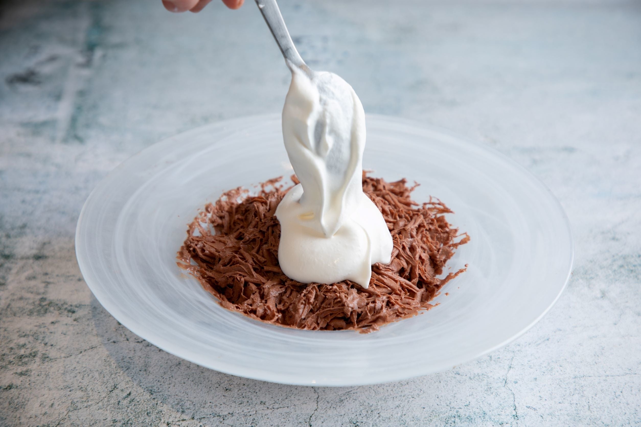 HUGEのレストランでは食後のデザートとして楽しんで頂くシーンが多いことを想定し、インパクトが残る様カカオの分量を調整しご提供。できたてのShave Iceの上にのせるのは、ふわふわの生クリーム。