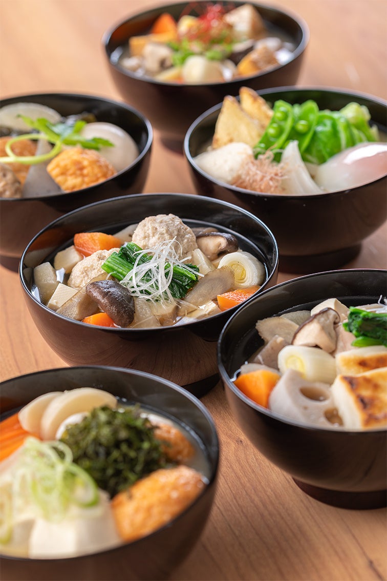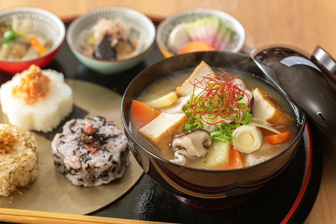 東京ソラマチ店の看板メニューは、旬の野菜と出汁の旨みが詰まった「具だくさんの汁もの」と「花むすび」。日本のベーシックな食事のかたち、汁ものとご飯という組み合わせで、”旬の美味しさ”や”ヘルシーさ”をテーマに、“田ノ実らしさ”を加えてお届けします。