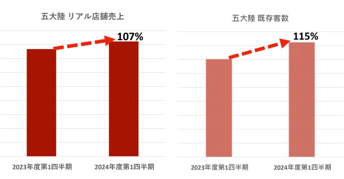 オンワード樫山の紳士服を展開する「五大陸」は、リアル店舗売上において、2023年度比107%を達成。さらに、3~4月に製品を購入した顧客が5月に再来店するなど、既存顧客のリピート購入促進にも成功しており、既存客数2023年度比は115%となっています。特に、ポロシャツや夏物のジャケットなどのクールビズアイテムが売上を伸ばしており、季節のトレンドを捉えたアイテムの販売により、既存顧客に早いサイクルで再来店いただくことができ、顧客の定着化を成功させることができたと考えられます。