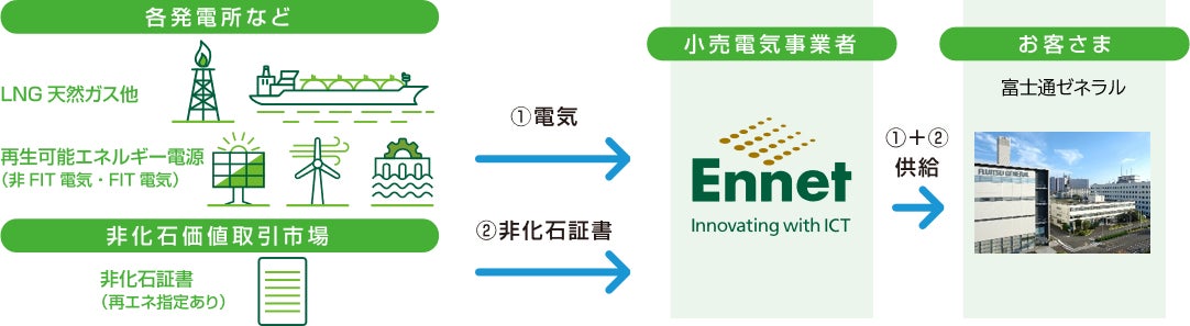 EnneGreenは電気(主に天然ガス発電等の電気)に再エネ指定の非化石証書を組み合わせ、CO2の排出量を実質ゼロとするもので、既にEnneGreenを導入済みの全国29の営業拠点に加え、このたび本社にも採用が実現いたしました。本導入開始をもって、富士通ゼネラルグループ全拠点の事業活動で使用する全ての電気は、実質的に再生可能エネルギー100%となります