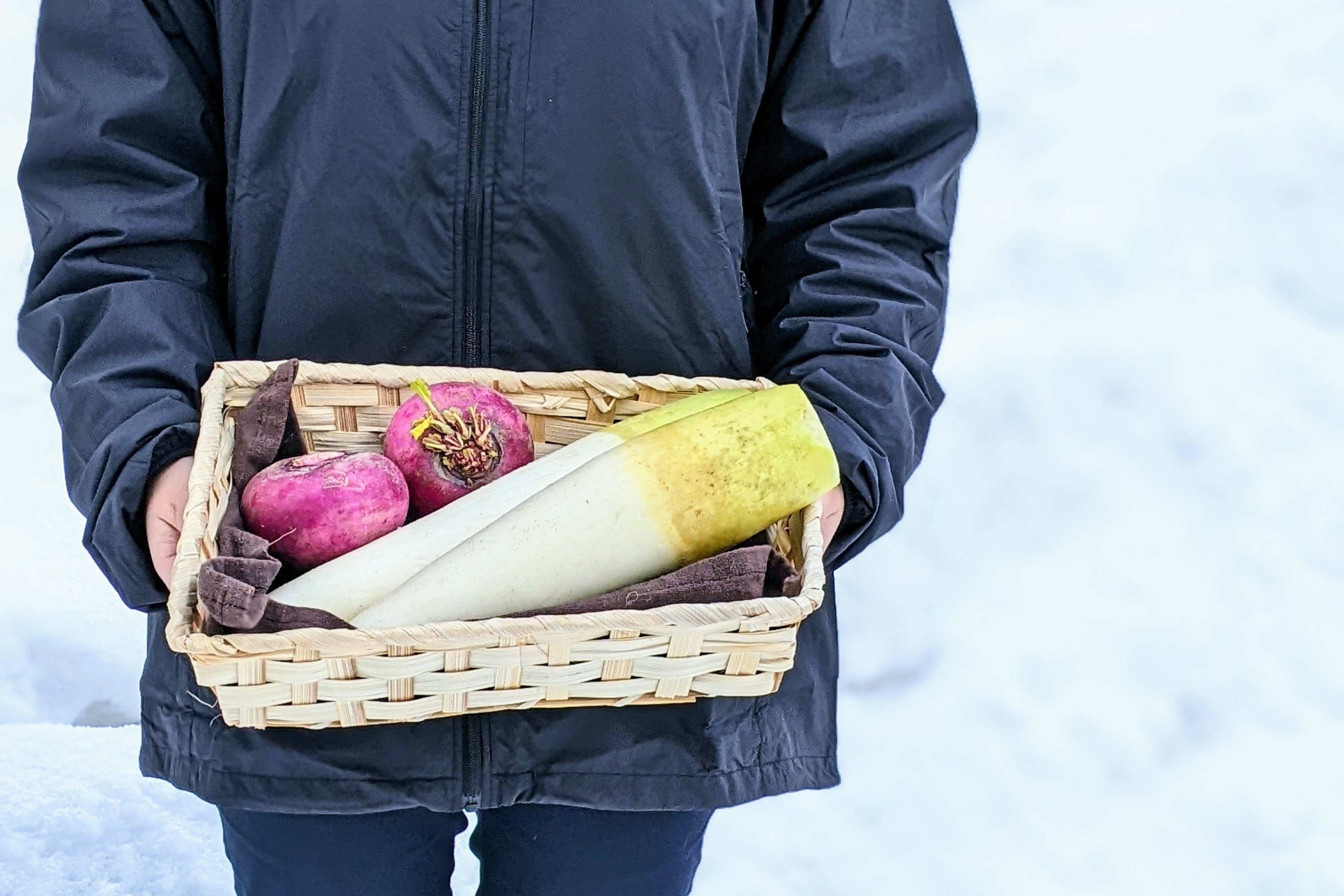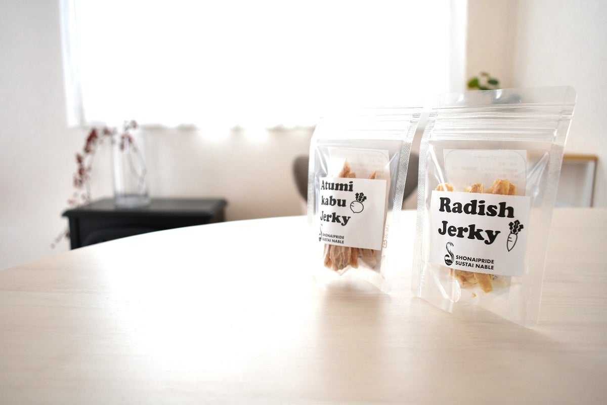 山形県庄内地方(酒田市・鶴岡市)で生産された特産の大根とあつみかぶ(赤カブ)。その中で、大きすぎたり一部が雪焼けしたりが原因で、廃棄せざるを得ない材料を使用して生まれた、ナチュラルでサステナブルな「野菜のジャーキー」です。