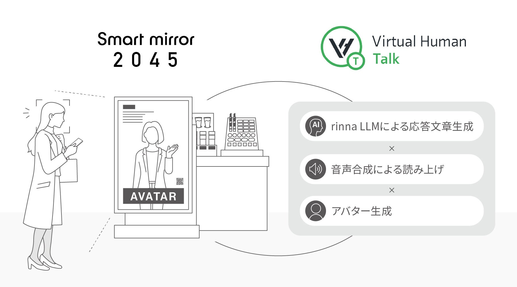 本システムは、rinnaの高度なAI技術が搭載された「Virtual Human Talk」を、「スマートミラー2045」にバンドルすることで、等身大のバーチャルヒューマンがユーザーとのインタラクティブな対話を可能とするハードソフト一体となったシステムです。rinnaが提供するSDKを、各種アプリやデジタルサービスに組み込むことで、様々なビジネスシナリオにあわせた顧客体験の向上やエンゲージメントの促進に繋がることを期待しており、リアルな見た目のAIアバターの音声は、実在する人物の声を合成することでより自然な会話の実現も可能です。
