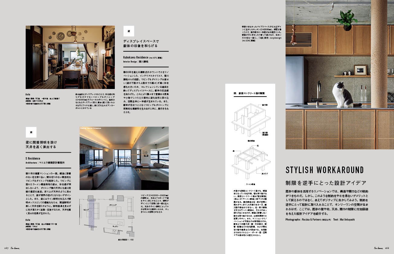 既存の躯体を活用するリノベーションでは、構造や開口などの制約がつきもの。しかし、このような制約をやむを得ないデメリットとして捉えるのではなく、あえてポジティブに生かしてみましょう。制約を逆手にとって設計に取り入れることで、オンリーワンの空間が生まれるはずです。ここでは、既存の壁や柱、天井、開口の制限に付加価値を与えた設計アイデアを紹介します。