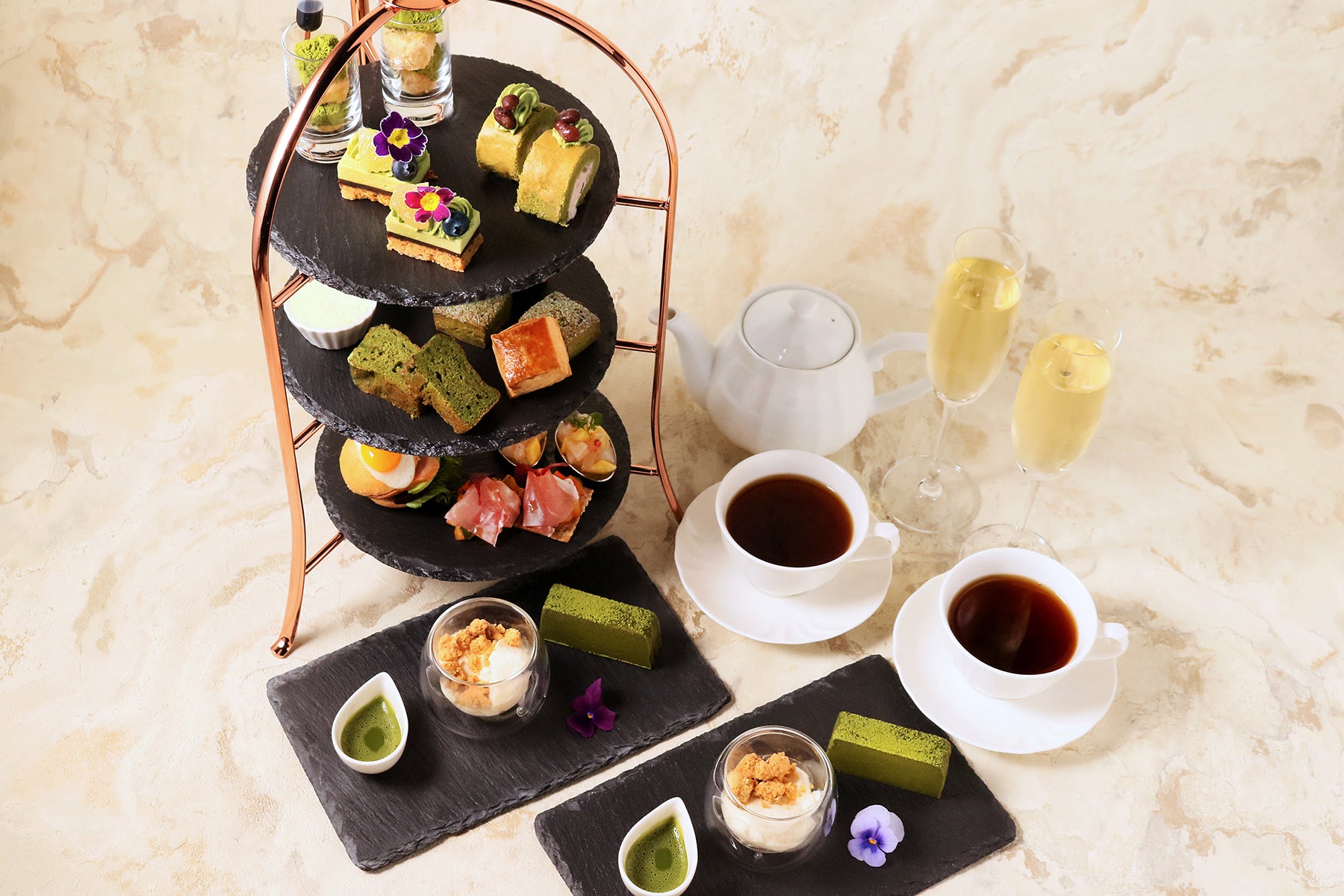 タワー1段目は、2種のわらびもち(ヴェルジョワーズ*の黒蜜付)、抹茶レアチーズタルト、抹茶ロールケーキ・小倉クリーム。さまざまな触感の抹茶スイーツが楽しめます。