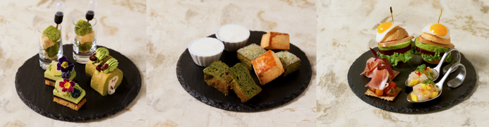 タワー2段目は、アフタヌーンティーの王道の一品。プレーン、抹茶とホワイトチョコチップスコーンをご準備しました。クロテッドクリームをつけて召し上がりください。英国発祥のパウンドケーキも抹茶味に。
