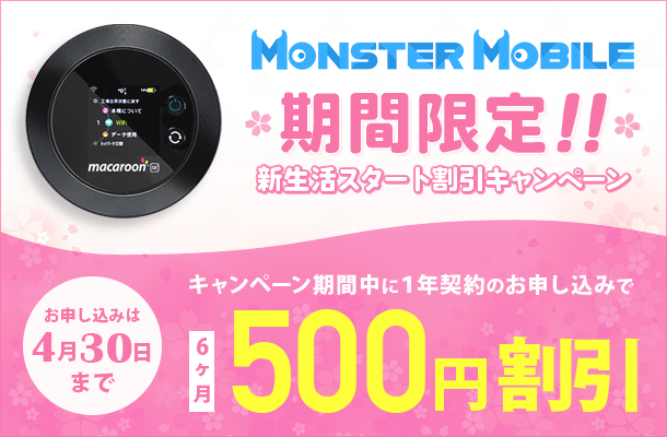 モバイルWi-Fi「MONSTER MOBILE」新生活スタート割引キャンペーン実施のお知らせ