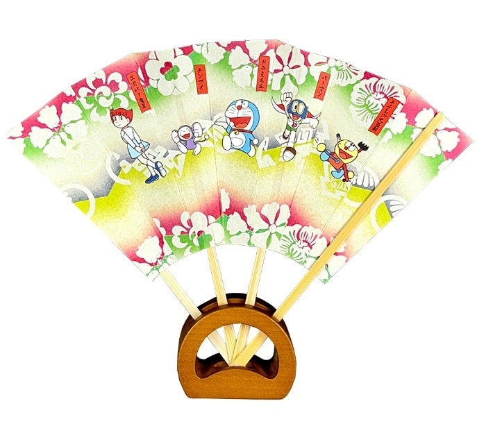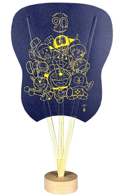 また、「祝絵 団扇」は『ドラえもん』『パーマン』『キテレツ大百科』『エスパー魔美』『21エモン』『モジャ公』『チンプイ』『ポコニャン』『ウメ星デンカ』から、ドラえもん、パーマン、コロ助、佐倉魔美、21エモン、モジャラ、チンプイ、ポコニャン、デンカといった個性豊かなキャラクター達が大集合した限定デザイン。葛飾北斎の作品でよく知られる藍=北斎ブルーを背景に施し、藤子・F・不二雄生誕90周年記念のお祝い絵としてファンの皆さんが愛して止まないキャラクター達を金色で表現した竹団扇です。
