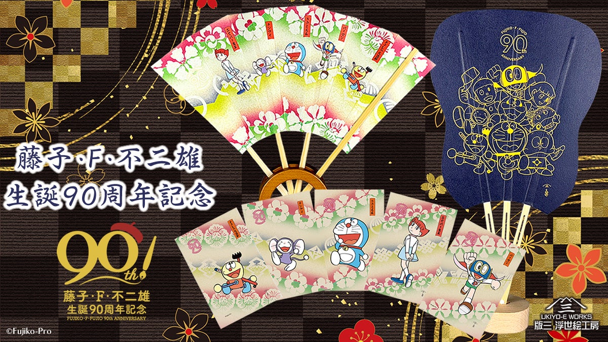 ドラえもんたち人気キャラクターが勢揃い!藤子・F・不二雄生誕90周年記念の浮世絵作品としてポストカード・扇子・団扇が浮世絵ならではの背景や色彩を施し華やかに登場!