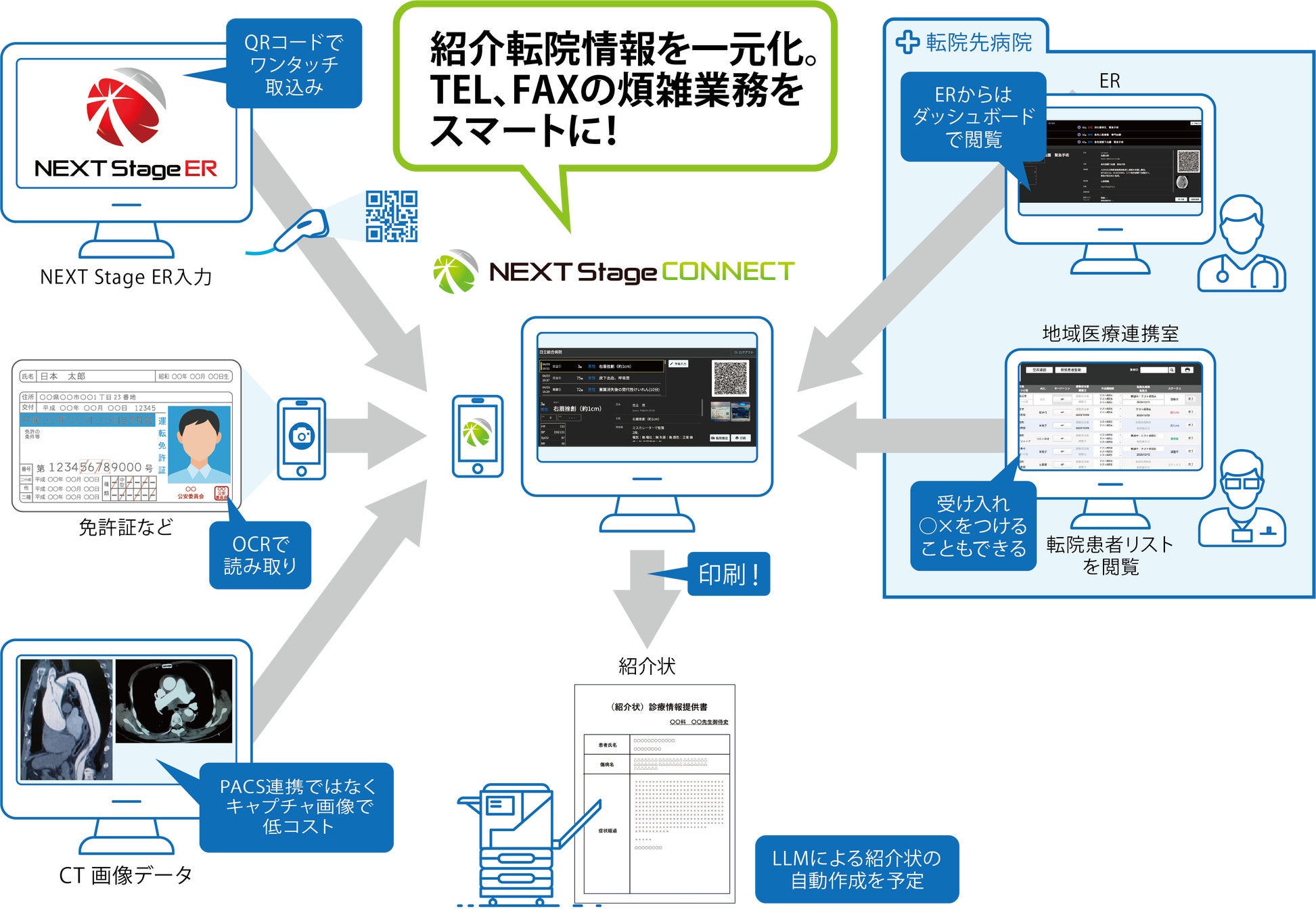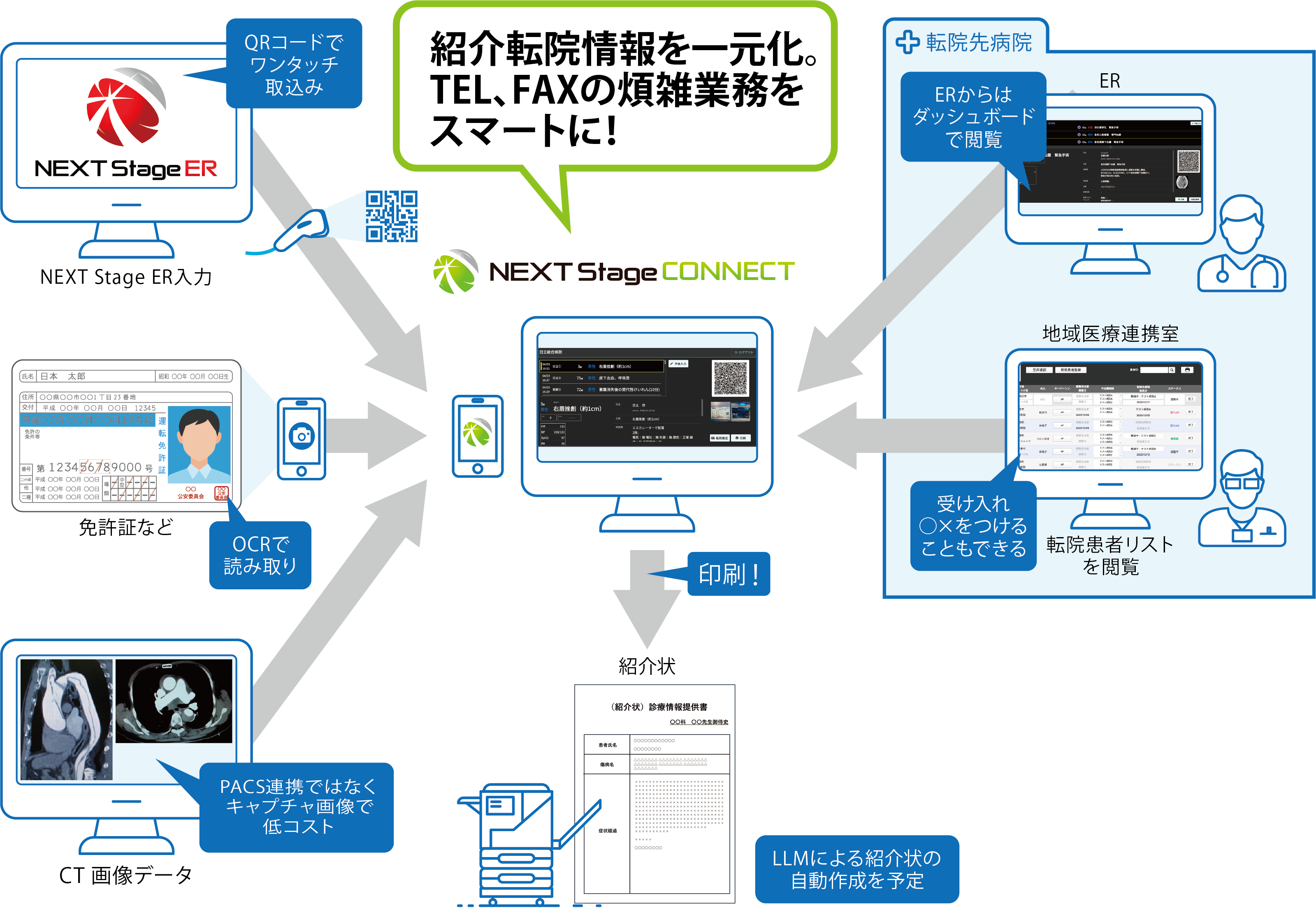本システムは、転院搬送する患者の情報共有・転院調整を行うことができる急性期転院搬送支援ツールです。患者情報の入力には、OCR(Optical Character Reader、光学的文字認識)機能を用いており、カルテのテキスト記載・身分証明書・お薬手帳を撮影しテキスト化することで、迅速な入力を実現します。CT画像などの重要な臨床画像も添付でき、より精度の高い情報を簡便に伝えることができます。また、当社NEXT Stage ER※の導入病院では、NEXT Stage ERからの情報をQRコードにて転記し、そのまま転院搬送先候補病院に送信することが可能です。※txpmedical.jp/service/next-stage-er