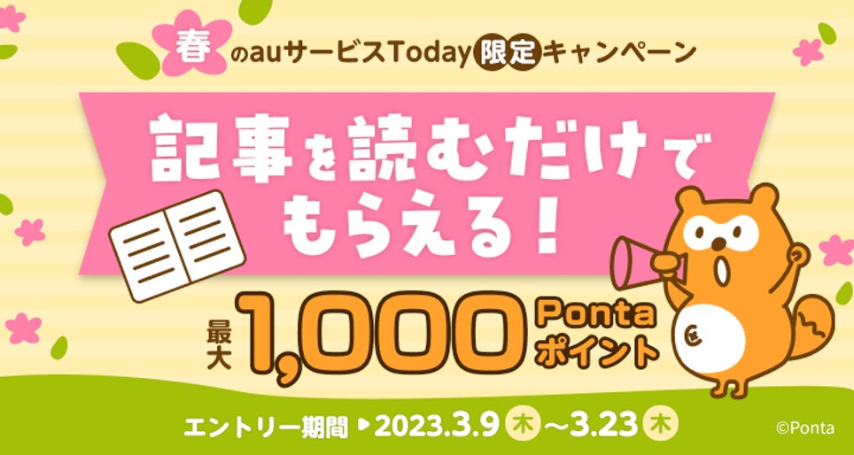 株式会社Gunosy(本社:東京都渋谷区、代表取締役社長:竹谷祐哉、以下 Gunosy)は、ポータルアプリ「auサービスToday」内で、「春のauサービスToday限定キャンペーン」を3月9日(木)10時00分〜3月29日(水)23時59分の期間限定で開催いたします。auサービスTodayアプリでキャンペーンにエントリーし、期間中に1日1記事 合計7日間記事を読むだけで参加可能、抽選で最大1,000Pontaポイントが当たるお得なキャンペーンです。抽選で選ばれたユーザーには1,000Pontaポイントが加算される他、外れてしまったユーザーでも必ず10Pontaポイントが加算されます。
