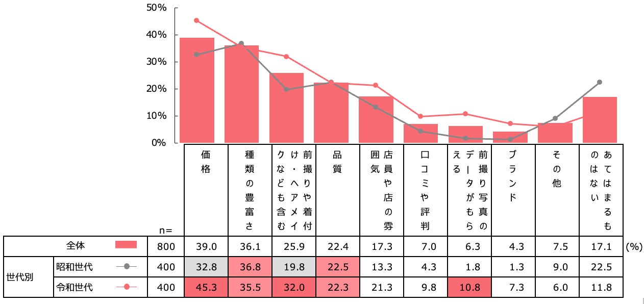 また、振袖選びの基準に関しては、世代間で差が見られたポイントとして「価格」「着付け・ヘアメイク」「前撮りデータ」の3点が挙げられます。特に「価格」については、令和世代がSNSを通じた情報収集を積極的に行っている影響もあり、昭和世代と比較してより明確に「コスパ」を意識していることが分かりました。
