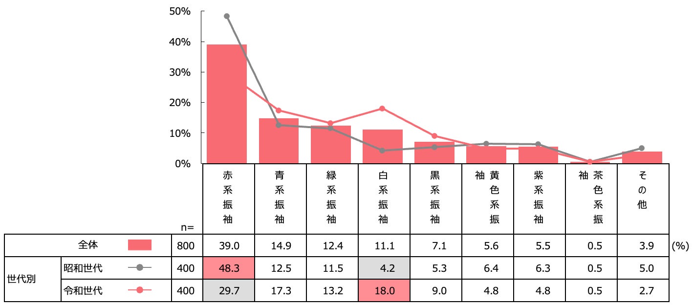 ◾️振袖の人気カラーに見る世代間の変化。昭和世代は「赤一強」、令和世代は「白系」が台頭
