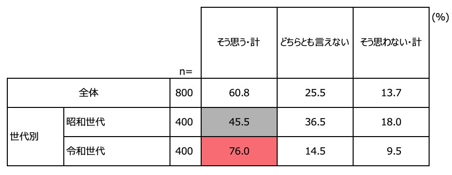 成人式が「必要だと思う」と回答した割合は、令和世代が76.0%であったのに対し、昭和世代では45.5%にとどまり、令和世代の方が成人式に対して前向きであることが明らかになりました。