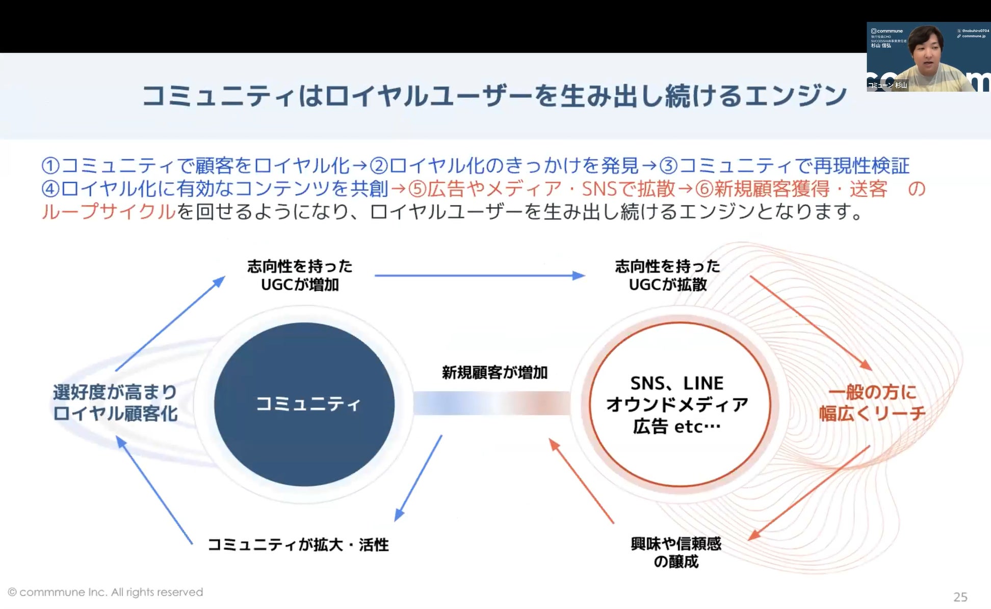 SNSとは別にコミュニティをつくる意義としては、双方向の対話でユーザーとの距離が縮まりファンが増え、ファンの理解度も上がるというということがあります。また、運営側が独自に設計したデータを取得できるというメリットもあります。「ファンのコミュニティがある」という状態からSNSを活用することで、新規顧客獲得や送客のループサイクルを回せるようになります。