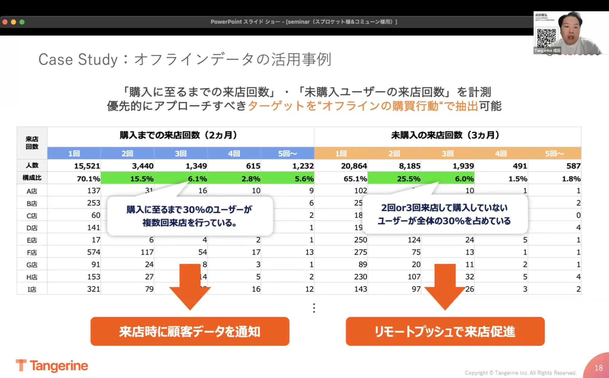 「購入に至るまでの来店回数」や「未購入ユーザーの来店回数」は、ロイヤルティの向上に直結するKPIとなるでしょう。ある2か月間の中で購入までに何回来店したのかというデータを分析したところ、約30%の顧客が購入に至るまでに複数回来店していることがわかりました。また、1回目の来店で購入に至る顧客よりも客単価が高いというデータも取れています。未購入顧客の来店回数を3か月の中で見てみると、約30%は2・3回来店しても購入に至っていないということがわかりました。そこに顧客育成の可能性が見いだせます。オフライン行動データを活用することで、優先的にアプローチすべきターゲットを抽出できます。