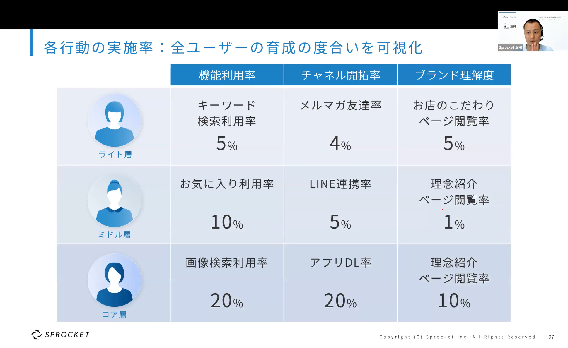 当日は、Sprocketの代表取締役である深田浩嗣からは「再訪、回遊、リピートなど顧客育成につながる行動データ活用」を解説。TangerineのCOOである成田雅弘氏からは「ロイヤルティの向上に直結するKPI」をお話しいただき、コミューンの執行役員CMO/SuccessHub事業責任者である杉山信弘氏には「コミュニティマーケティングでロイヤルティを向上する方法」をご紹介いただきました。