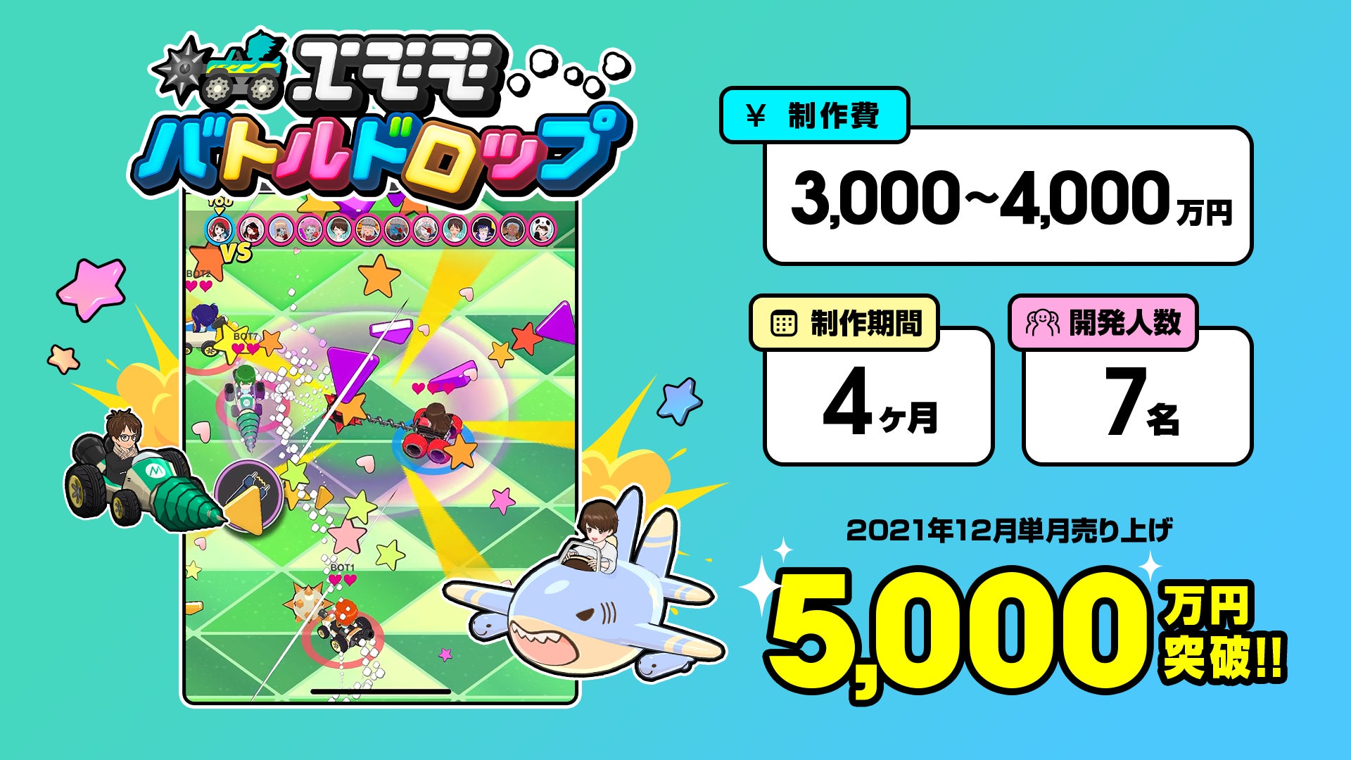 昨今、スマホゲームの開発費が高騰する中で、当社が開発したライブゲーム「エモモバトルドロップ」の開発費は約3,000万円〜4,000万円となりました。