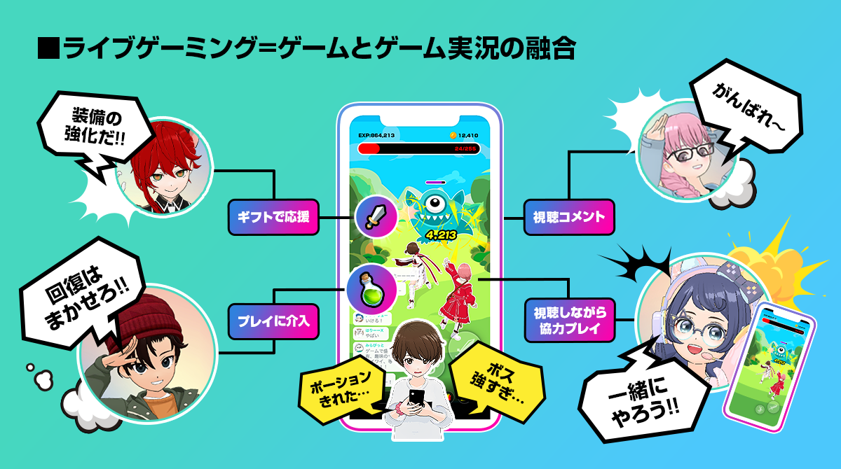 視聴者は従来のライブ配信のようにコメントやギフトアイテムを贈るだけでなく、実際に配信者といっしょにゲームをプレイする「参加型ライブゲーム」や、ギフトアイテムを通じてゲームに対して影響を与える「介入型ライブゲーム」など、今までのゲームやライブ配信とは全く違った体験を楽しむことができます。