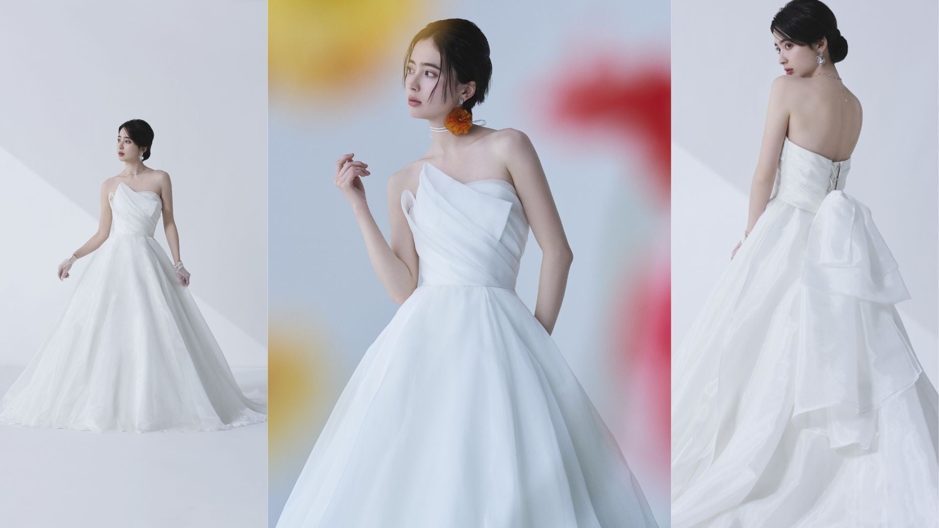 取り外し可能なバックリボンやトレーンの組み合わせで、4通りの着こなしも可能。