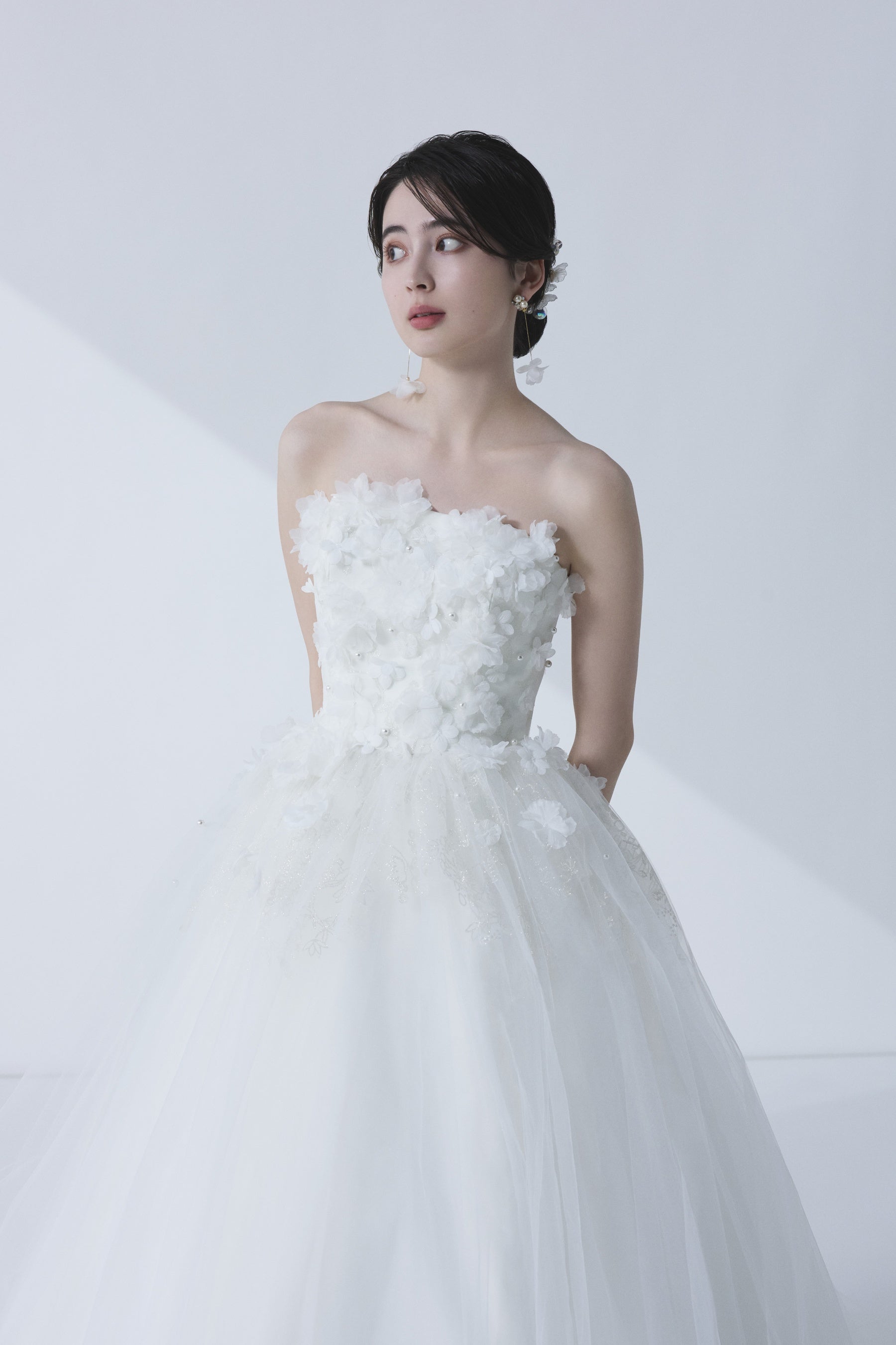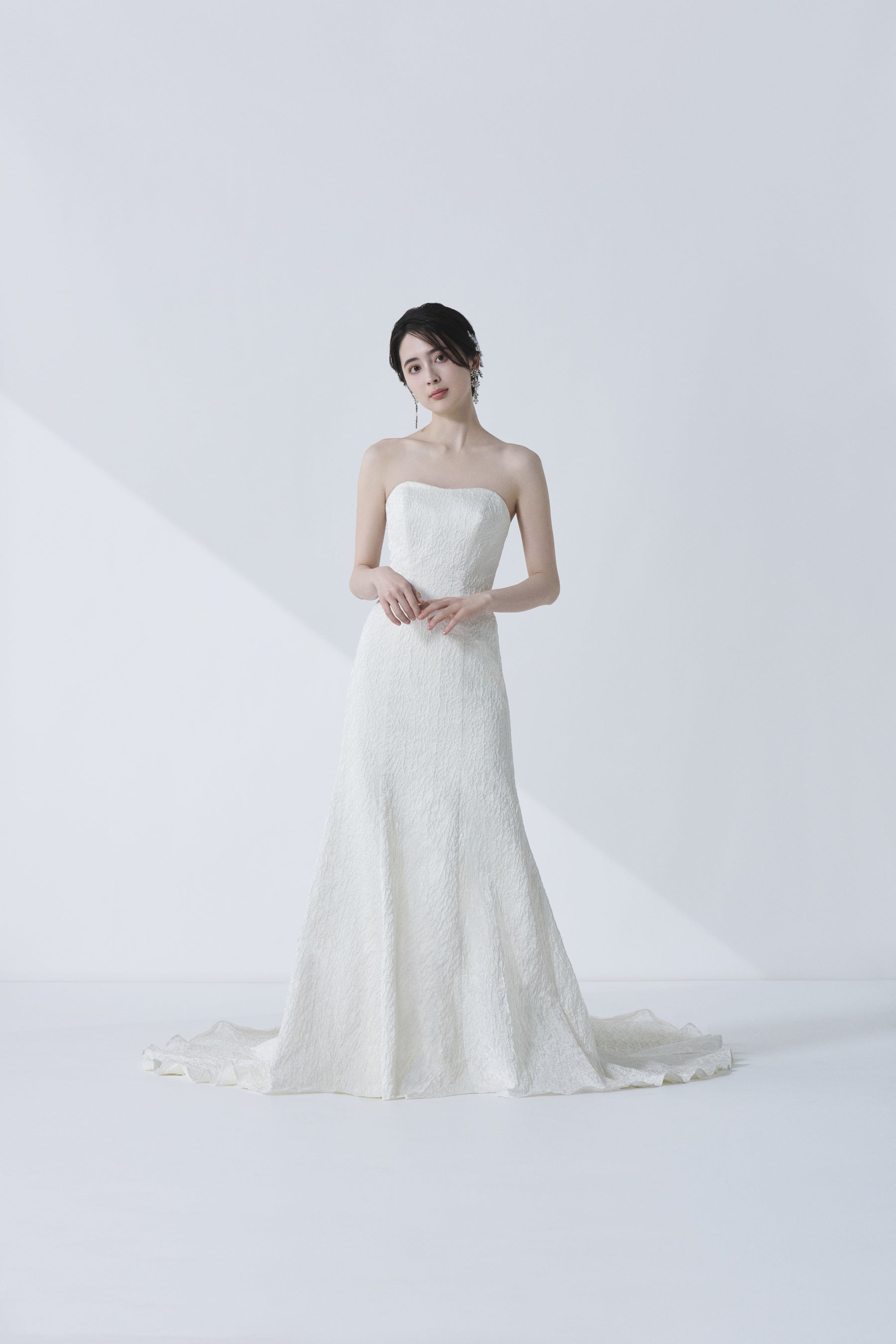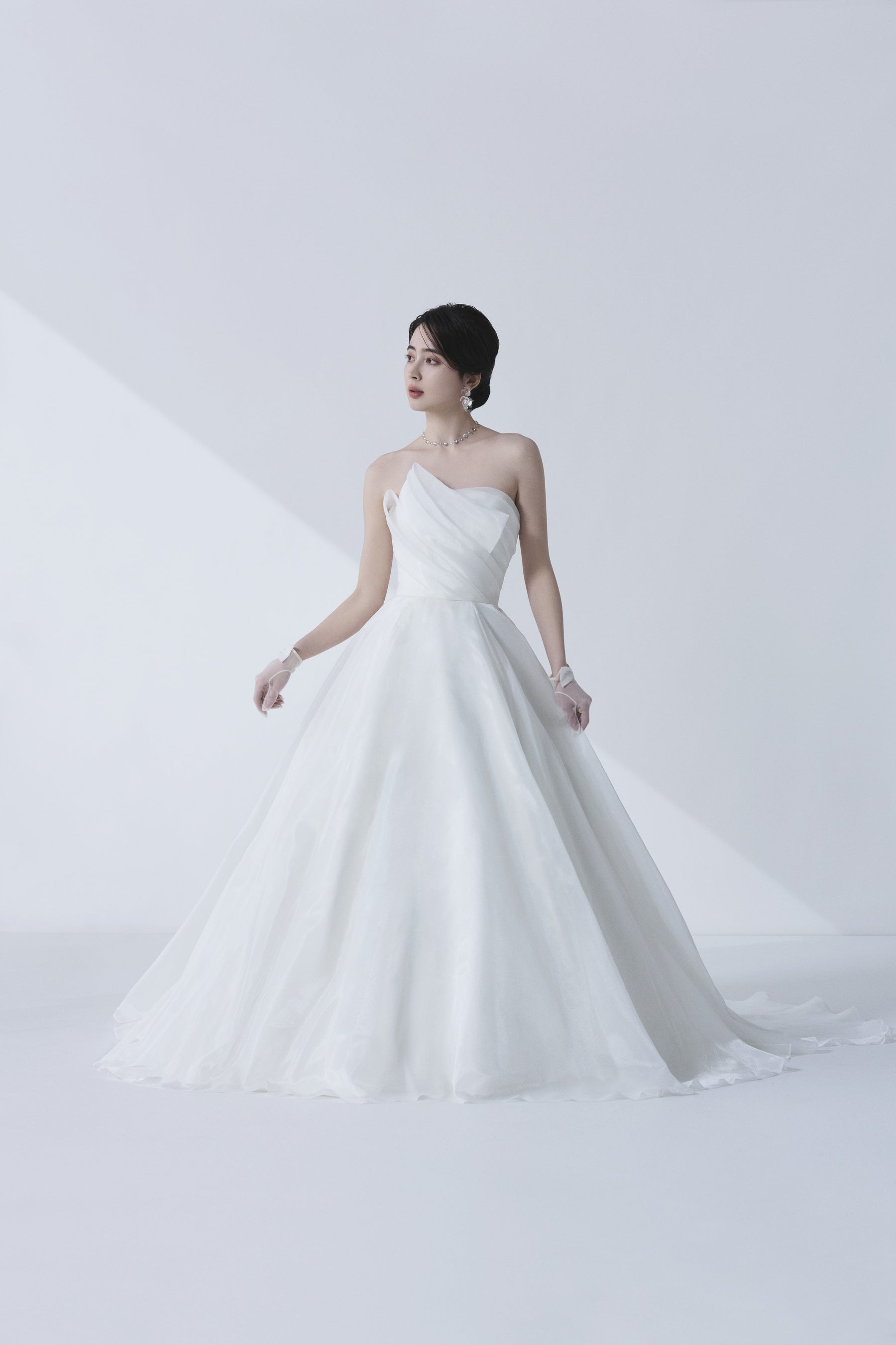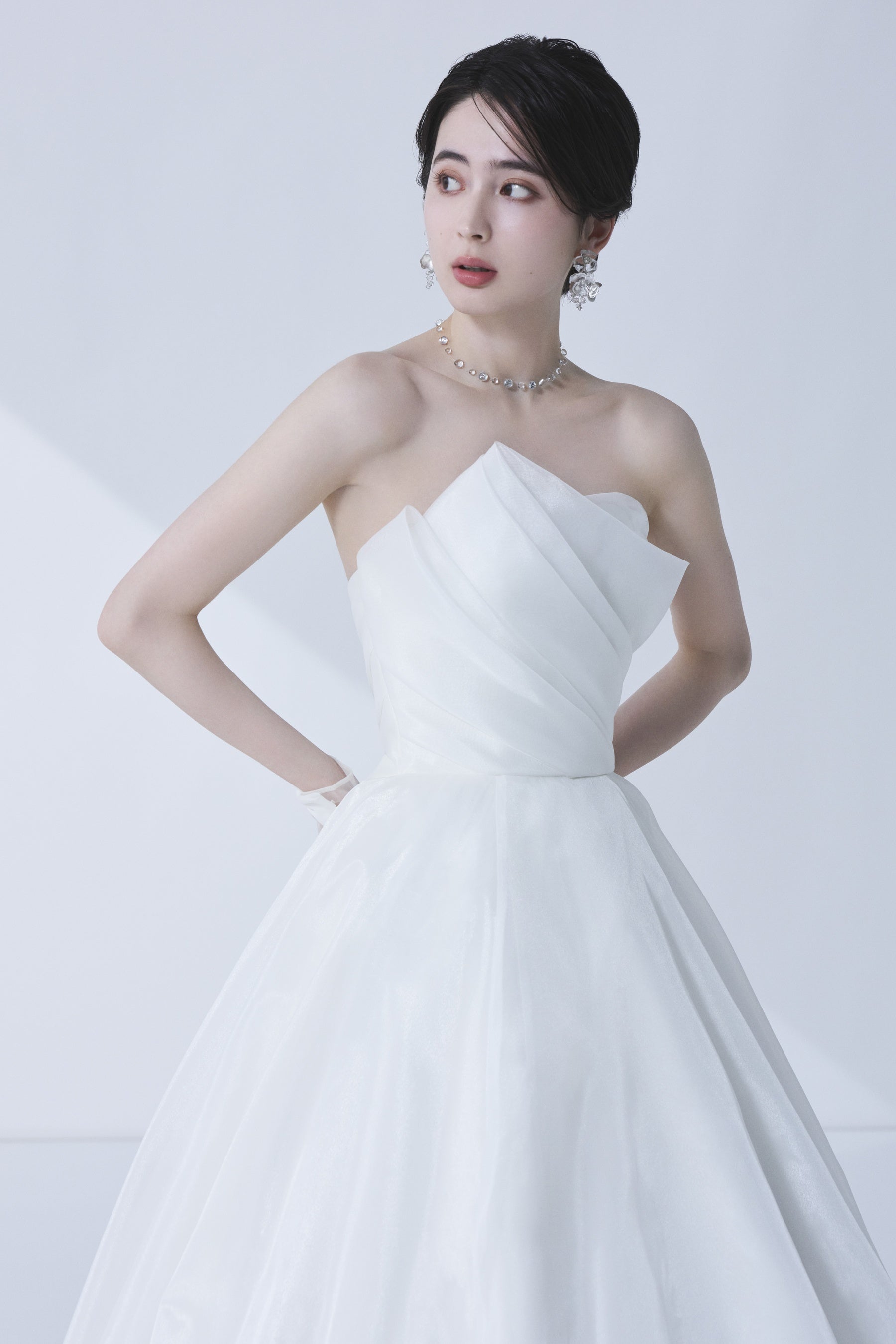その想いを重ね、胸元のアシンメトリーなデザインが顔まわりを華やかに彩ります。