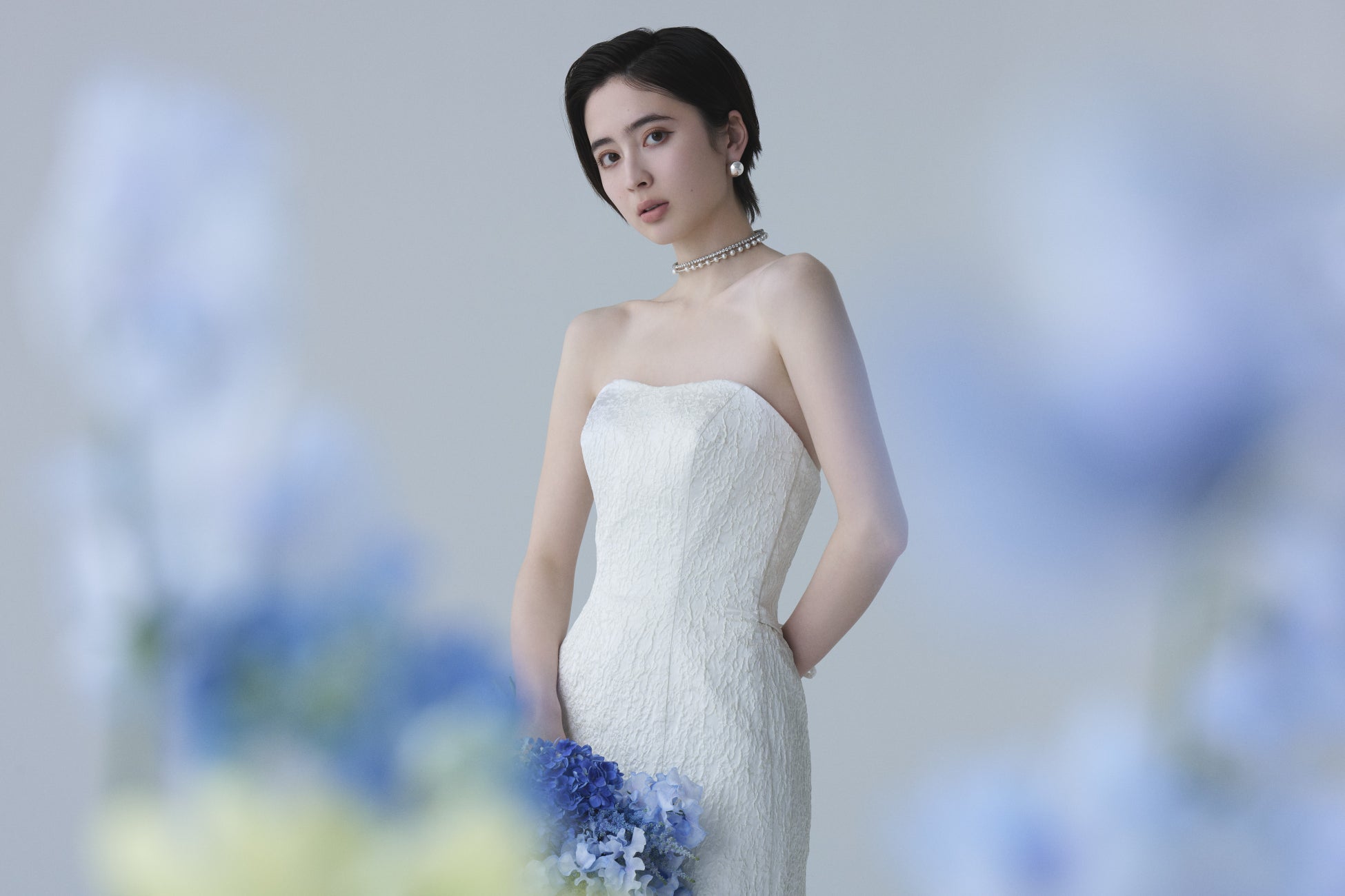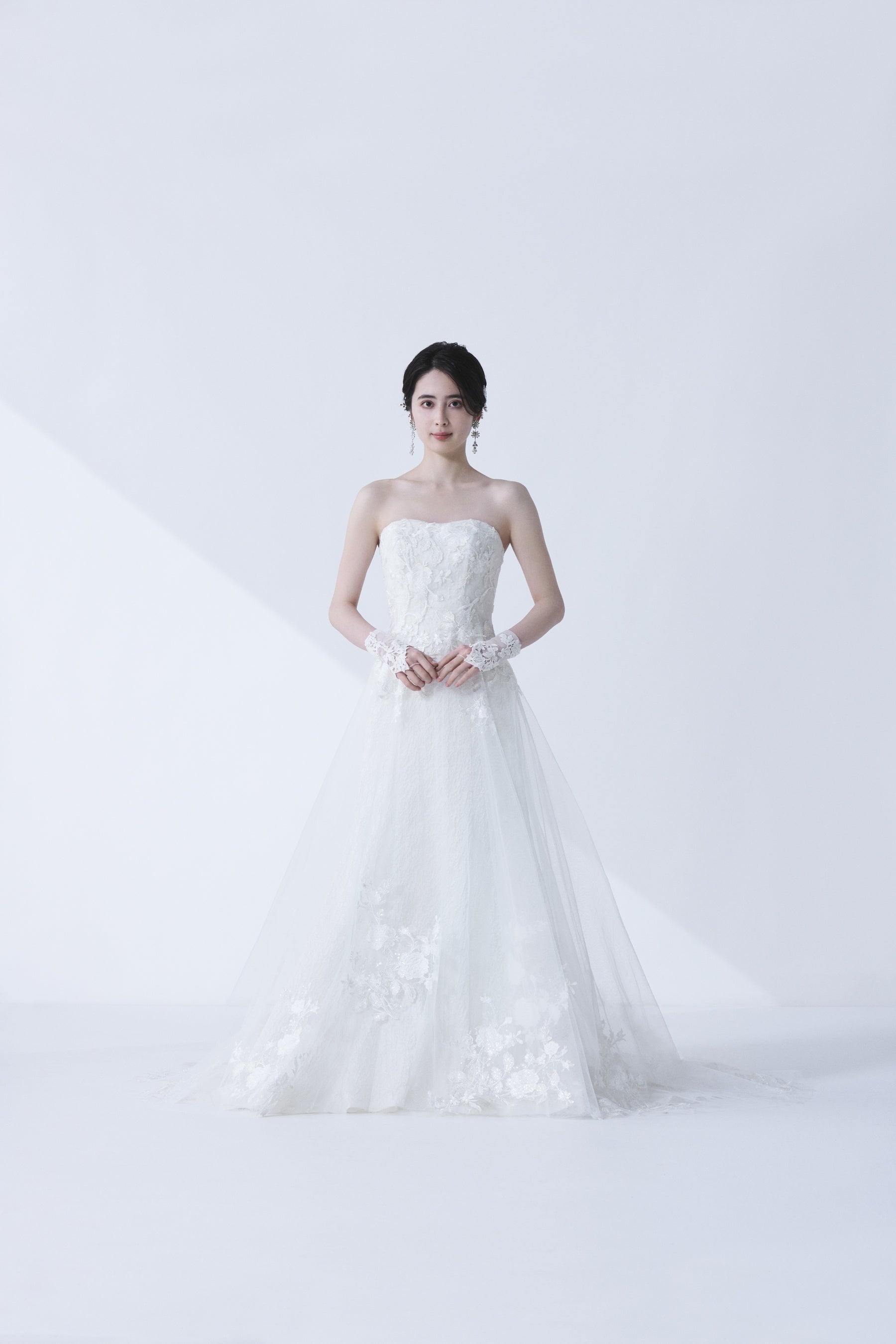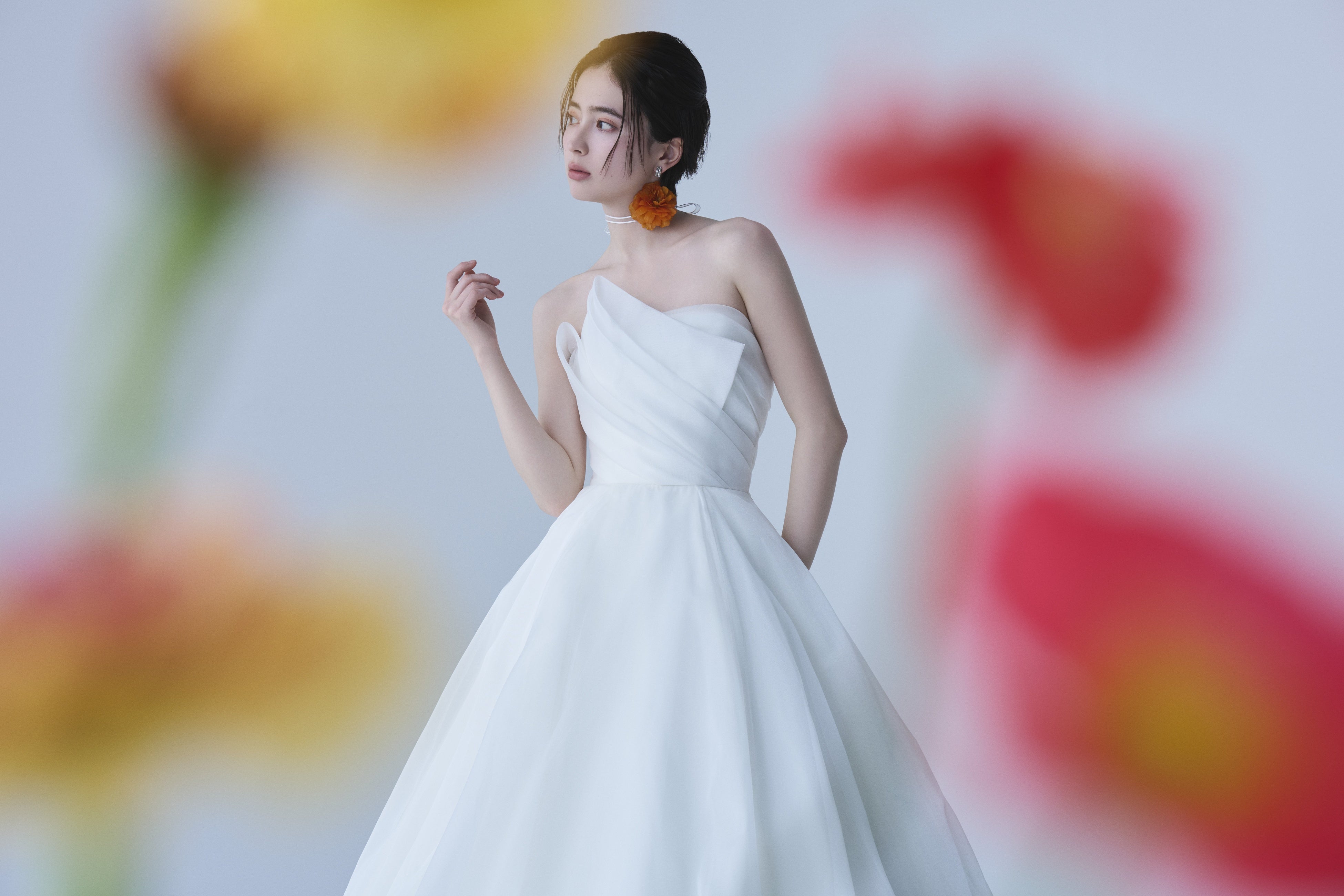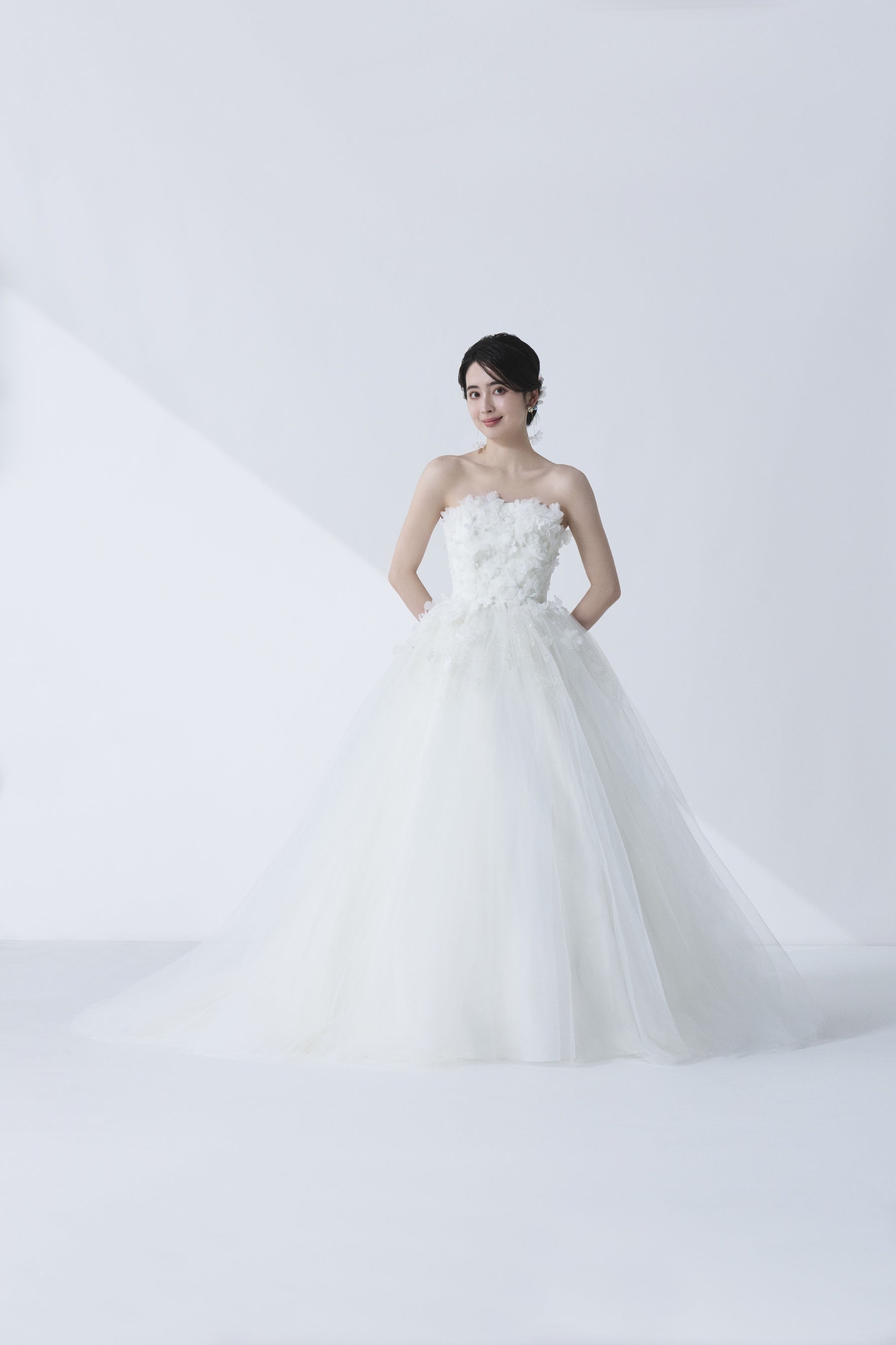 その想いを重ね、胸元のアシンメトリーなデザインが顔まわりを華やかに彩ります。