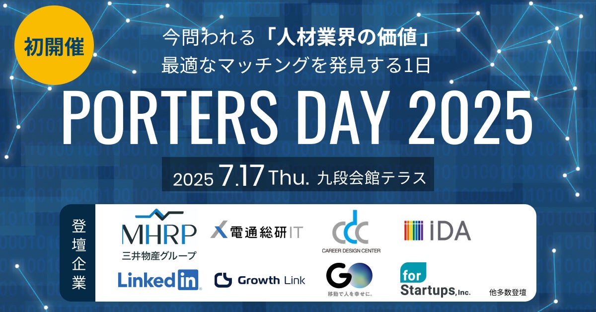 人材ビジネス向けマッチングシステムを提供するポーターズ株式会社(東京証券取引所グロース. 証券コード5126、東京都港区、代表 西森 康二、以下 ポーターズ)は、2025年7月17日(木)に人材事業領域特化のオフラインイベント『PORTERS DAY2025』を実施します。