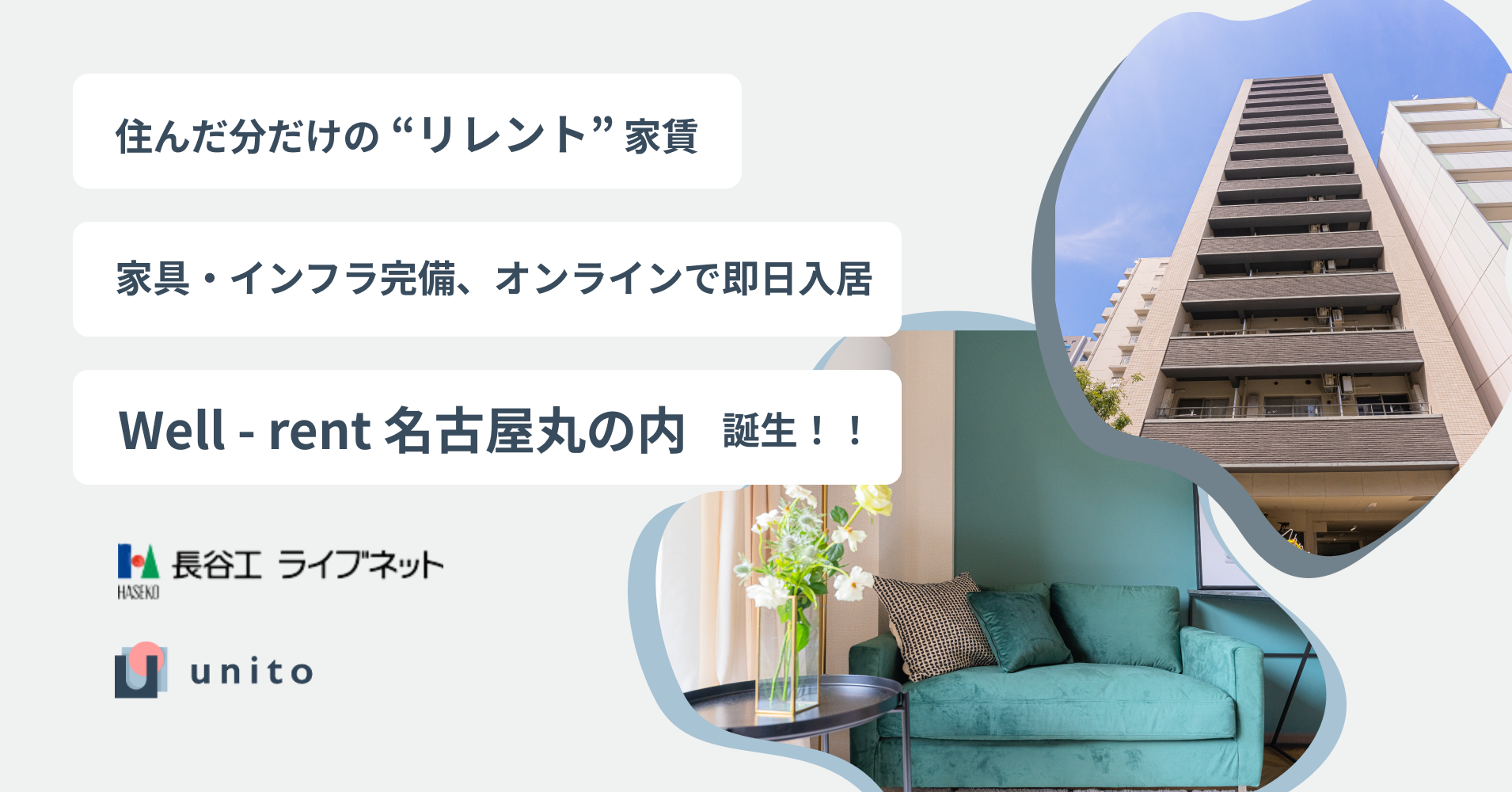 株式会社Unito(本社:東京都千代田区、代表取締役:近藤佑太朗、以下「Unito」)は、2023年5月29日(月)愛知県名古屋市に、株式会社長谷工ライブネット(本社:東京都港区、代表取締役社長:松田隆幸、以下「長谷工ライブネット」)との共同事業である「Well - rent 名古屋丸の内(ウェルレント ナゴヤマルノウチ)」(以下「本物件」)をオープンし、同時に入居者の募集を開始しました。
