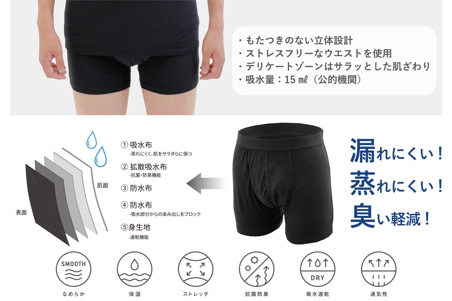 【男性向け吸水ショーツ】は、大人世代男性の多くが他人には知られたくない尿の”ちょい漏れ”の経験があるという課題に対し、見た目は通常のショーツながら、水分を吸水するパッドと快適に過ごすことのできる機能素材を使用したボクサータイプの吸水ショーツです。