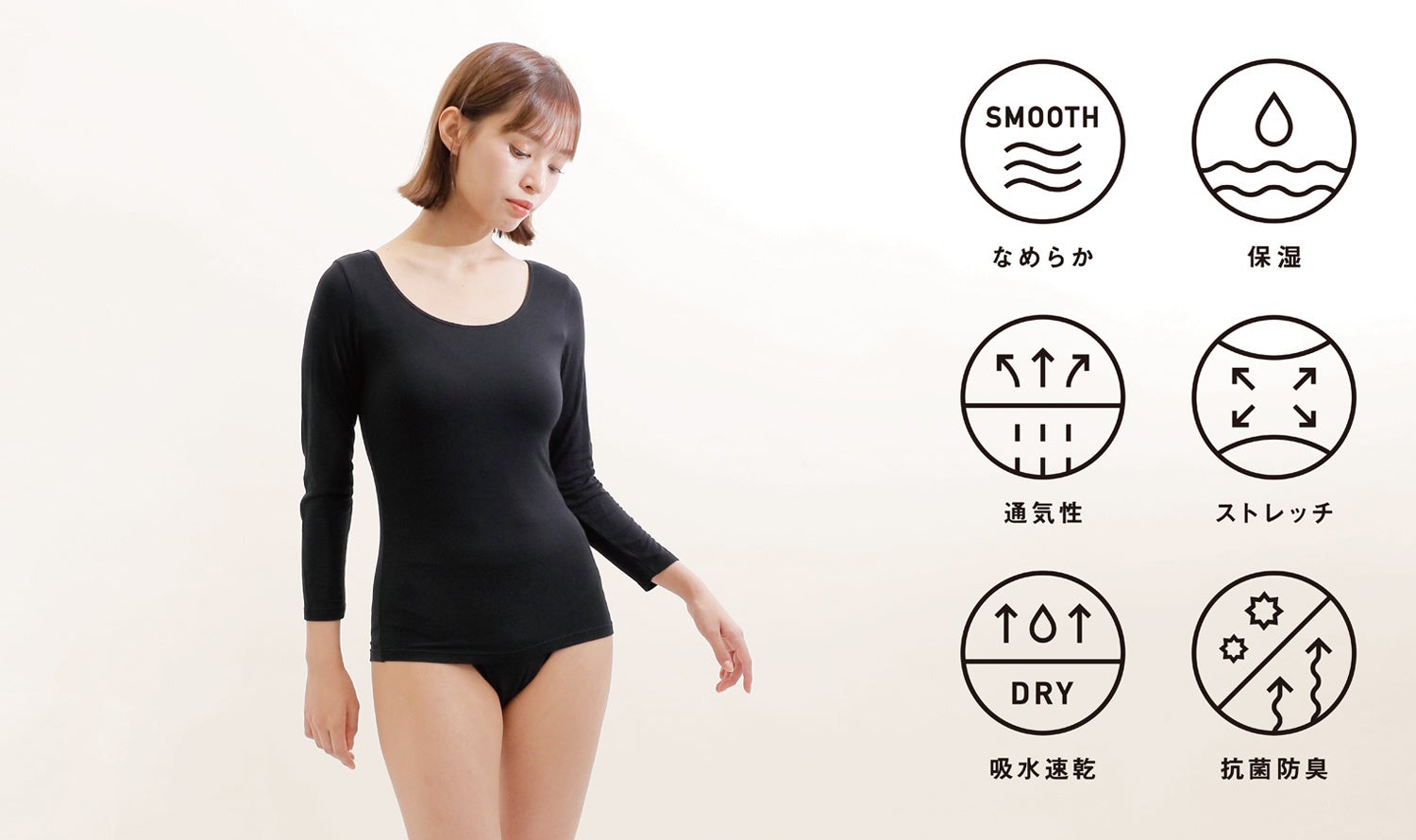 1.着ていることを感じさせないほどの肌なじみを叶える【なめらかレーヨン素材】