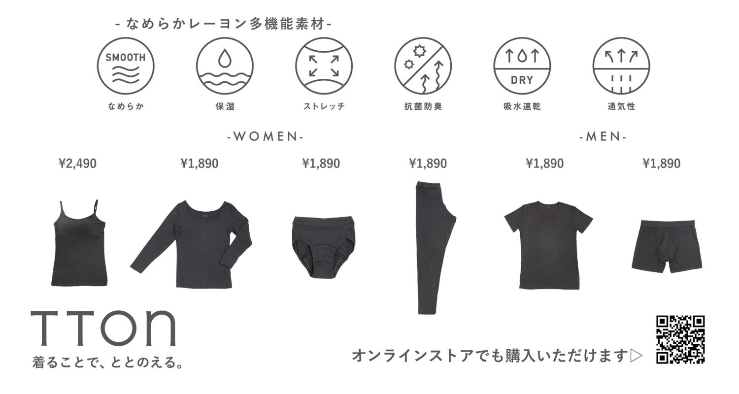 『TTON』は、「心地いい毎日のために“ととのえる”ちからをサポート」をコンセプトに、“肌をととのえる”“気持ちをととのえる”“生活をととのえる”など、気持ちとカラダのバランスがとれた心地いい毎日のために、ファッションと機能を融合させた商品を展開するプロジェクトです。