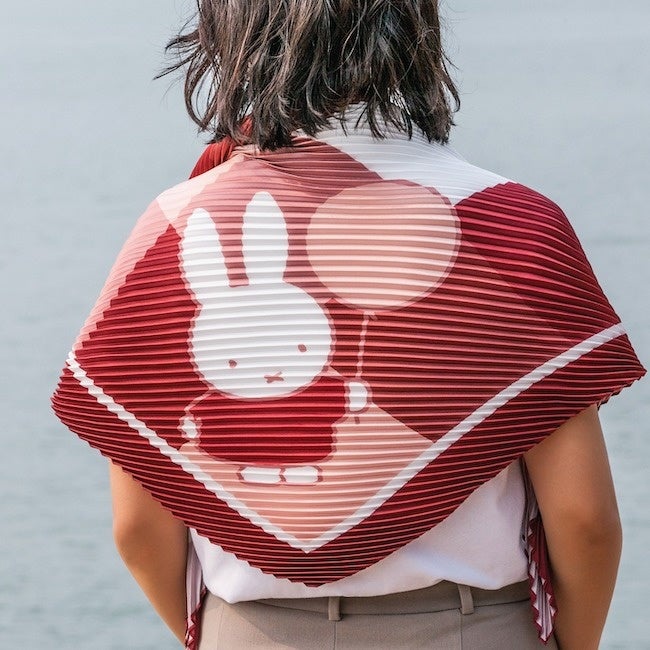 お誕生日にぴったりな、バルーンを持ったミッフィーのスカーフ 。大判サイズなので、これからの季節、冷房や日よけ対策にもおすすめです。プリーツのひだは崩れにくい特殊加工が施されています。