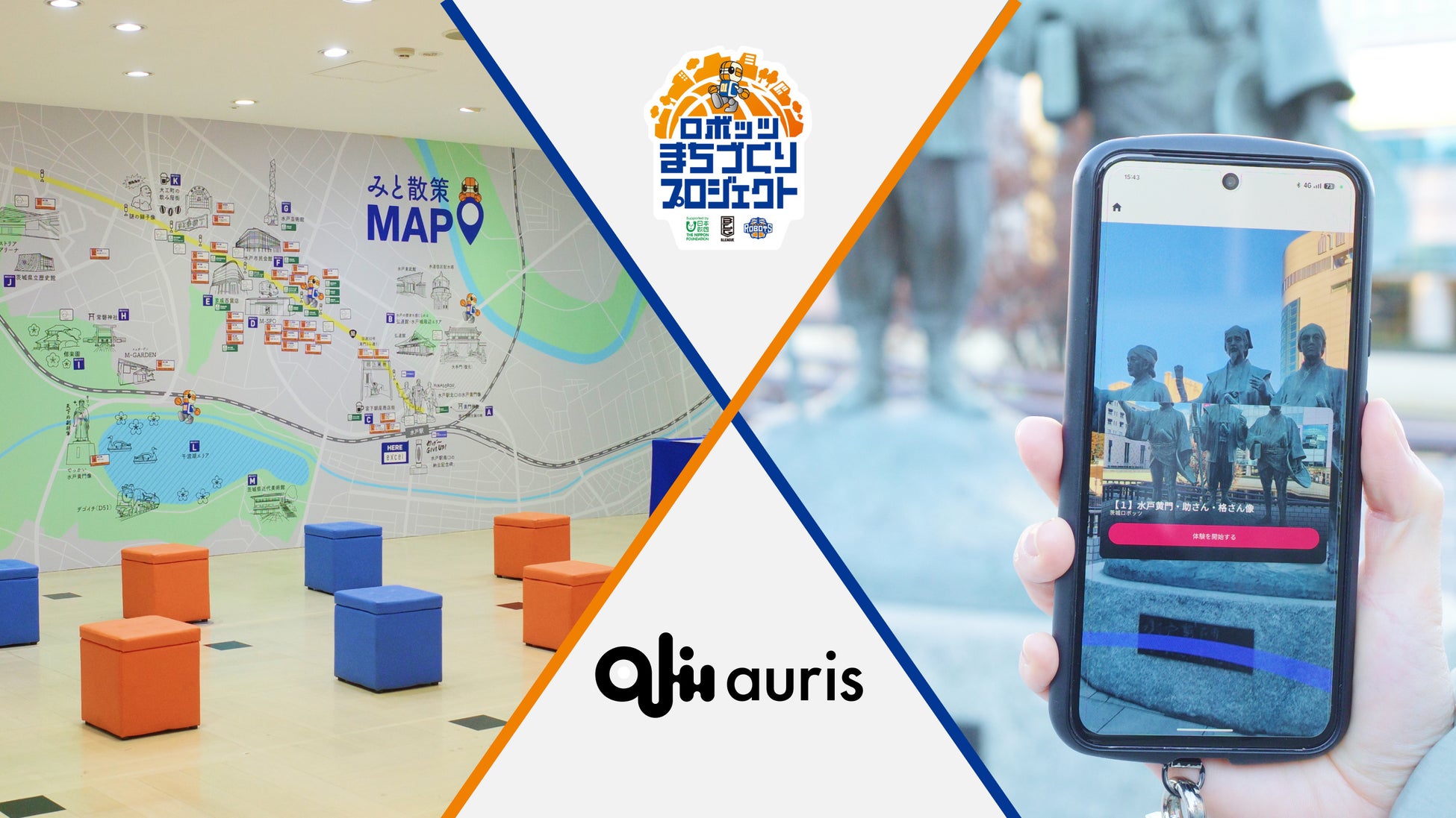今回は、ロボッツまちづくりステーション(水戸駅ビル エクセル本館3階)をスタート地点に、南町・大町・梅香・三の丸・宮町エリアなど、水戸駅北側を中心とした全24か所のスポットに音声コンテンツを配置。茨城ロボッツの選手や川﨑代表取締役社長、ロボッツダンスチーム「RDT」、さらには観光施設や地域で店舗を営む方々の声をAuris通じてお届けし、体験する皆さんが水戸のまちの温度感や日常の様子といった魅力を感じながらまちをめぐることができます。