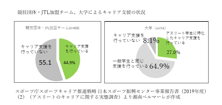 文科省の2019年の調べでは、トップアスリートを抱える競技団体、日本競技団体連携機構におけるキャリア支援は半数以下※1、また大学※2がアスリート学生に特化したキャリア支援の実態は3分の1以下であり、スポーツ業界の発展には一層のアスリートへの教育が必要と考えられています。