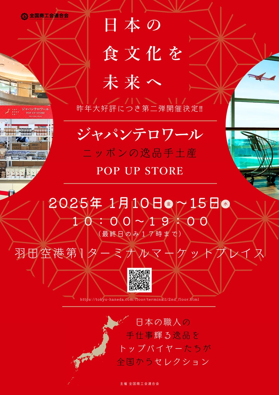 2025年1月10日(金)から1月15日(水)の5日間、羽田空港第1ターミナル2階マーケットプレイスにて、「ジャパンテロワール ニッポンの逸品手土産」を開催いたします。本イベントは昨年の3日間開催から規模を拡大し、より多くの来場者が楽しめる5日間に延長。全国47都道府県から厳選された150を超える逸品が並ぶ、まさに日本の食文化を堪能できる場となります。