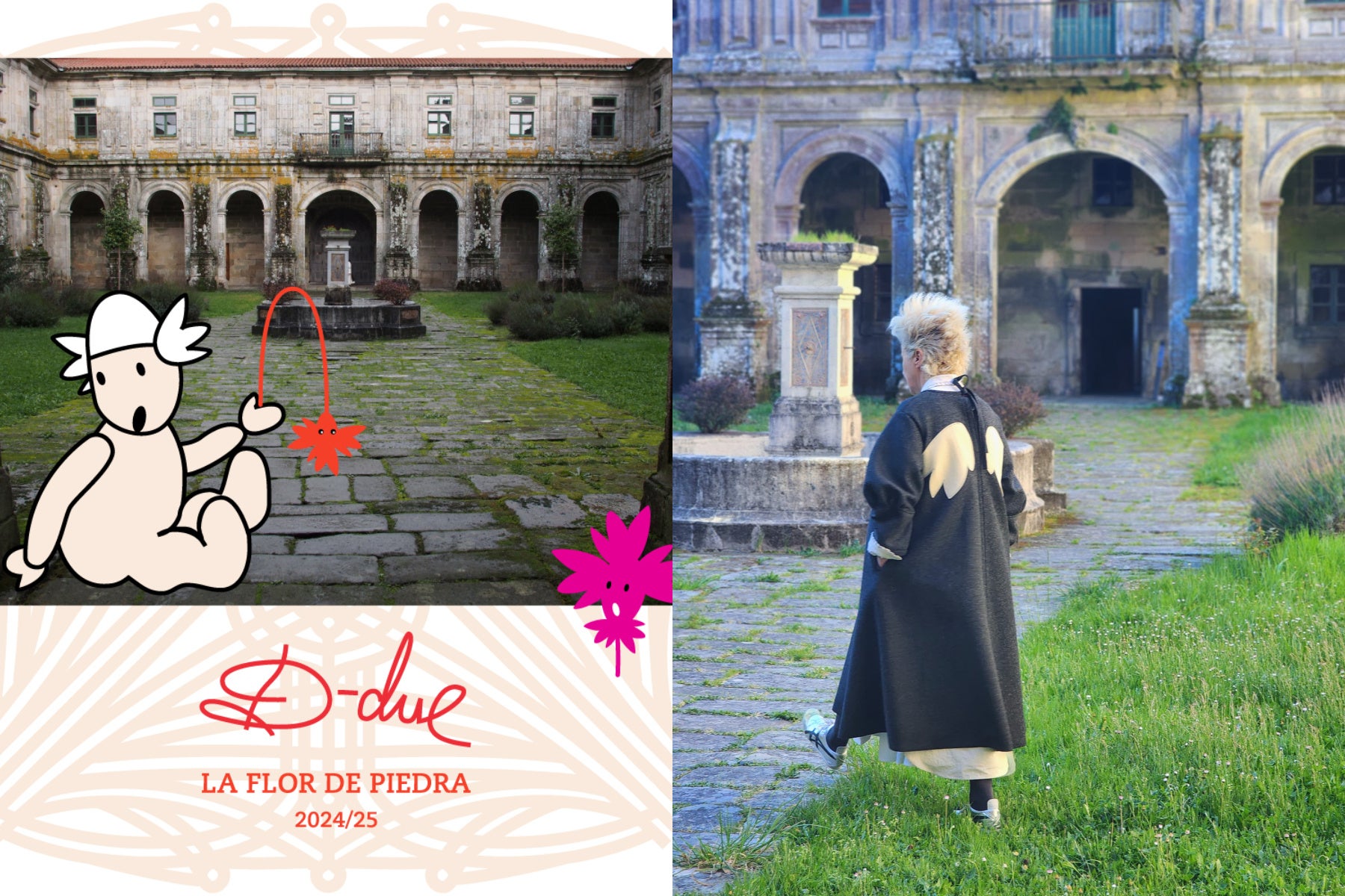 「デ・ドゥエ」は毎シーズン、ガリシア地方の風土やそこで暮らす人々のライフスタイルを投影したコンセプトをコレクションテーマに掲げ、アートのような制作プロセスによってものづくりを行っています。最新の2024年秋冬シーズンでは、ガリシア州にあるオセイラ修道院にインスパイアされたコレクションを発表。ガリシアの歴史と深く関係する、この修道院にまつわる重厚感ある物語を、デザイナーのアルフレドが描くポップなモチーフとの対比によって、アイロニーに富んだ作品に仕上げています。