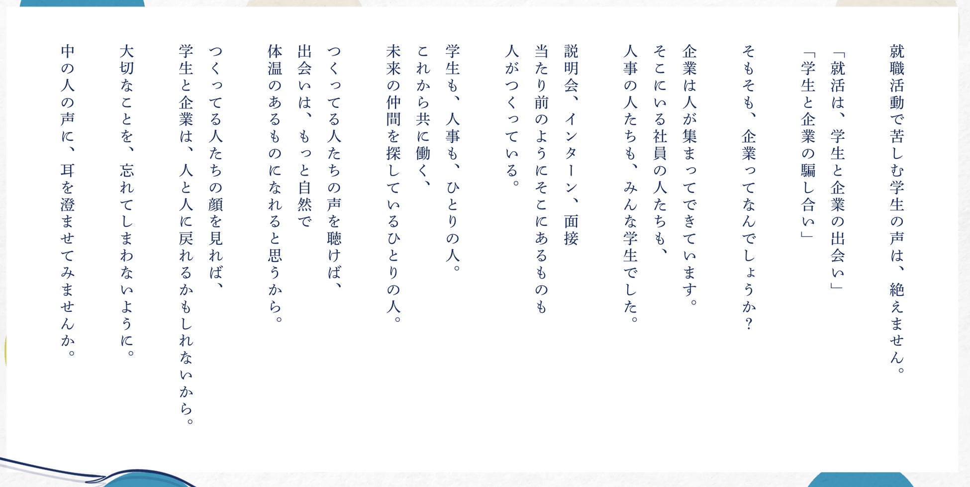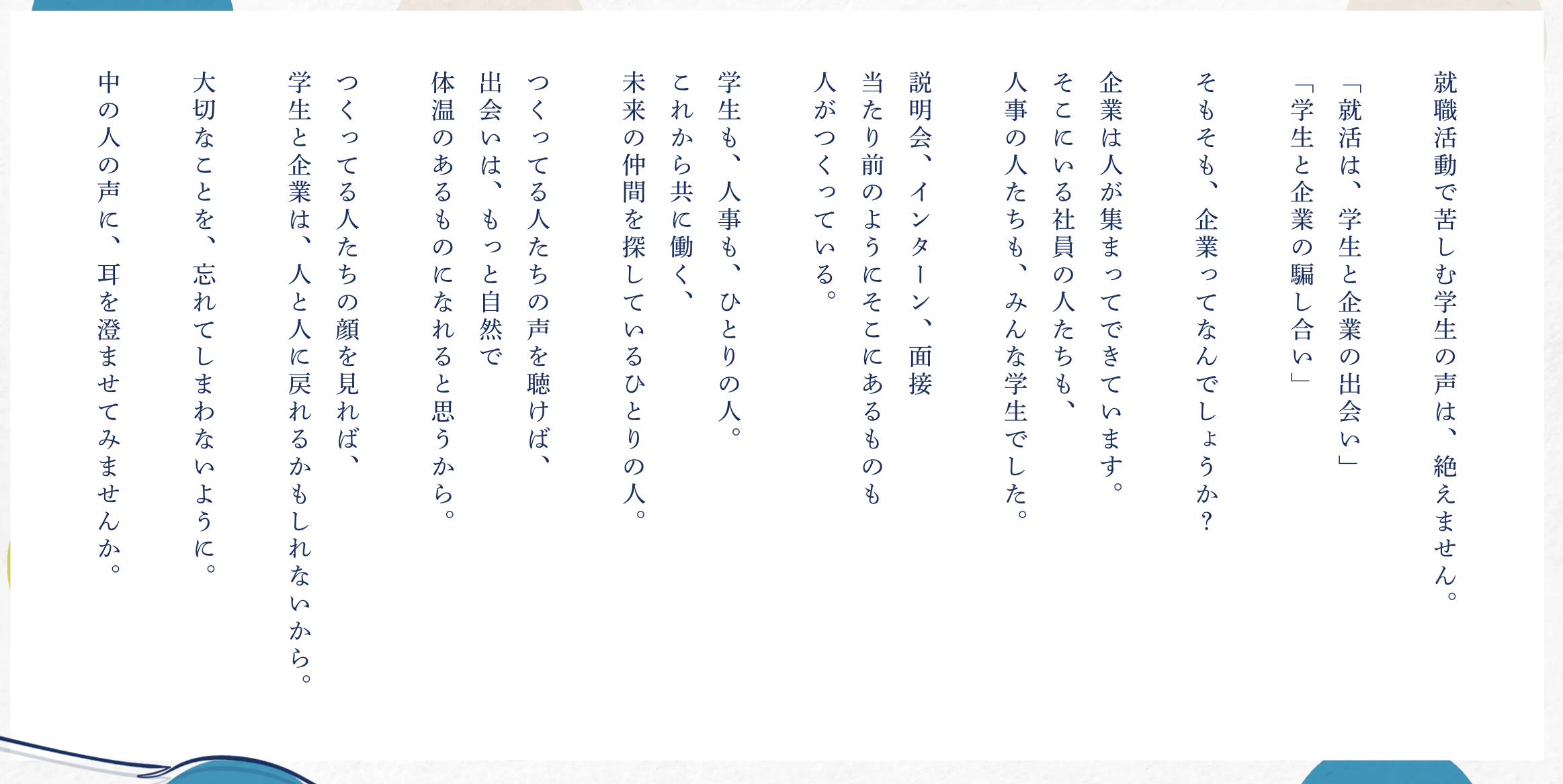 社会人として実際に働くようになり、法人である企業で働く個人ひとりひとりには仕事にかける想いがあること、それらが学生にうまく伝わっていないことをもったいないと思うようになりました。
