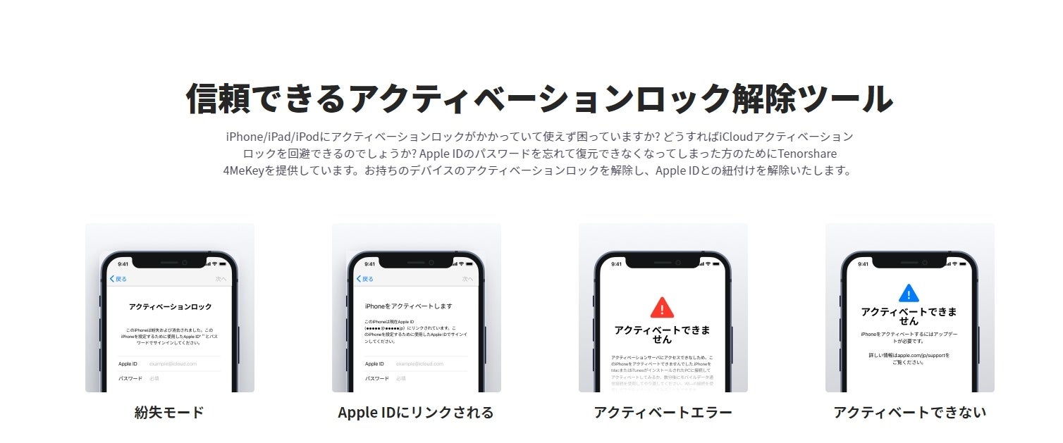 iPhone/iPad/iPodにアクティベーションロックがかかっていて使えず困っていますか? どうすればiCloudアクティベーションロックを回避できるのでしょうか? 中古iPadを購入時に元の持ち主がアクティベーションロックをかけたままといった場合はTenorshare 4MeKeyを利用して解除できます。