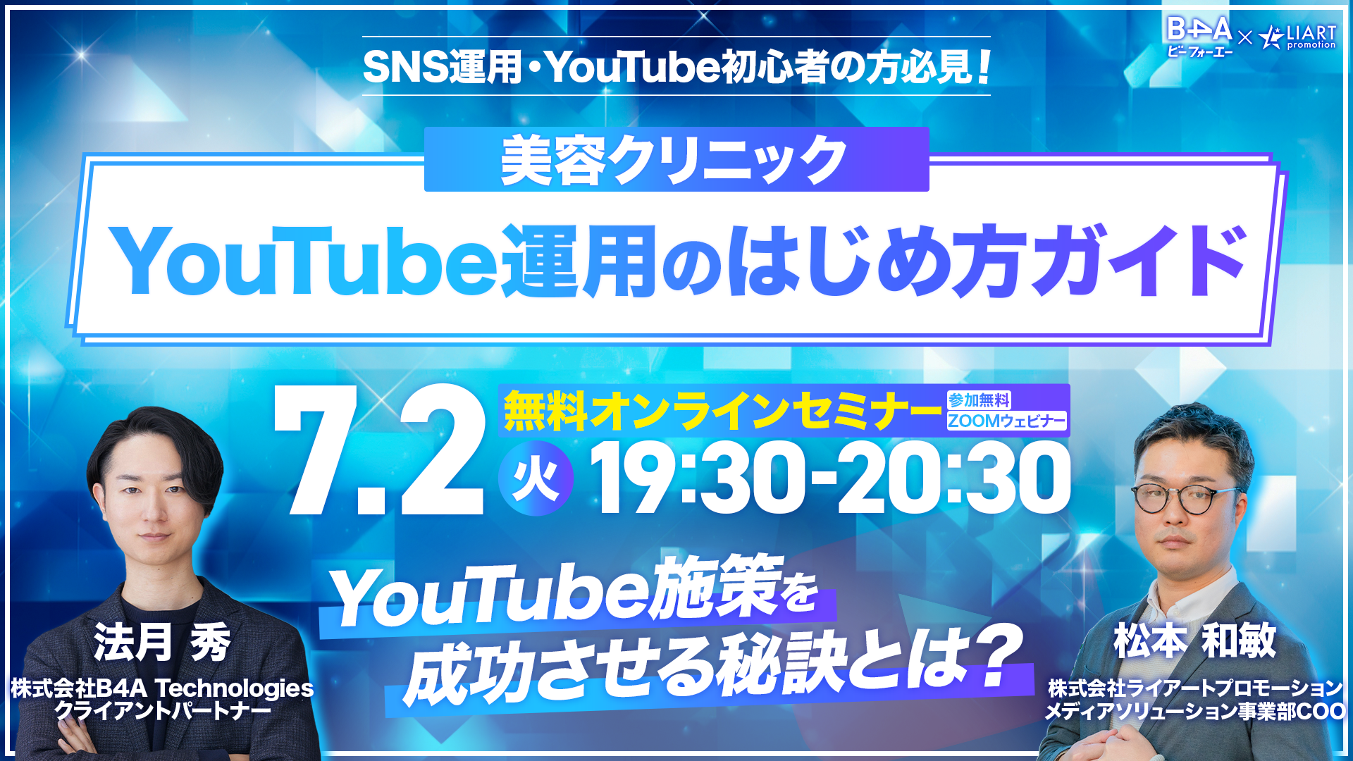 そこで本ウェビナーでは、累計50アカウントの美容医療クリニックのSNS運用に関わってきたライアートプロモーションと300院以上のクリニックを支援してきたB4Aの2社が、「美容クリニック YouTube運用のはじめ方ガイド」をトピックテーマにして分かりやすく解説していきます。