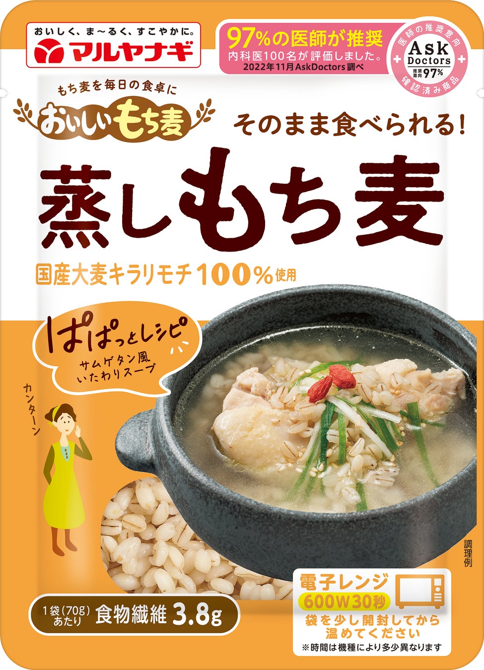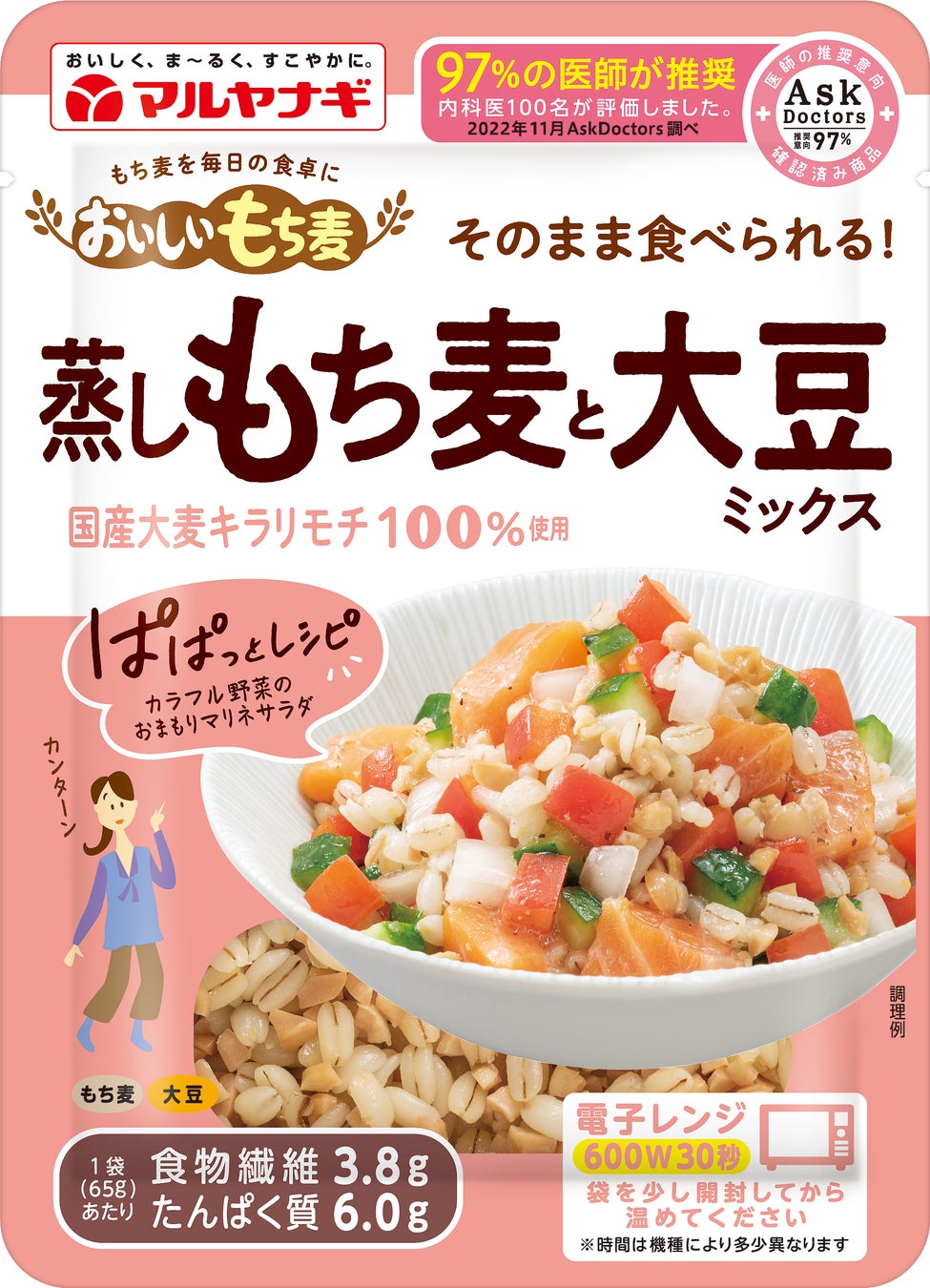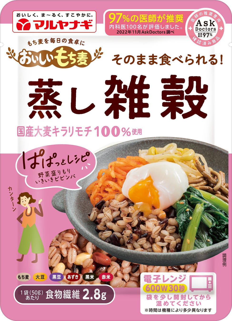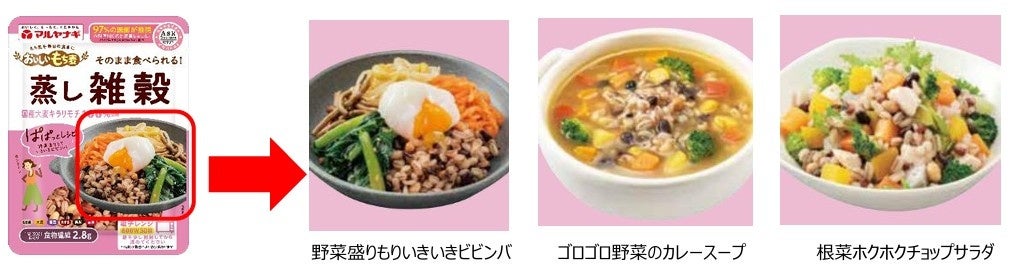 マルヤナギが2020年に行った調査で、蒸しもち麦は、主に40代~50代の女性に、「白ごはんに混ぜて」「スープに混ぜる」「サラダにトッピングする」の三大用途で広く親しまれていることがわかりました。これらの使い方に合わせ、毎日の食事に手軽に取り入れやすい“ぱぱっとレシピ”を掲載したアソートデザインに一新。思わず作ってみたくなる魅力的なレシピを集めました。