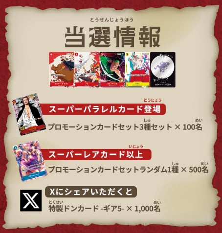 また、どんなカードが出てくるかわからない、開封する時のワクワクを多くの方々に体験いただける仕掛けとして「開けまして、おめでとう!ワンピカード開封体験」を展開。WEBサイト上でブースターパックを開けてレアカードを引くと抽選で1,000名様以上に豪華賞品が当たります。