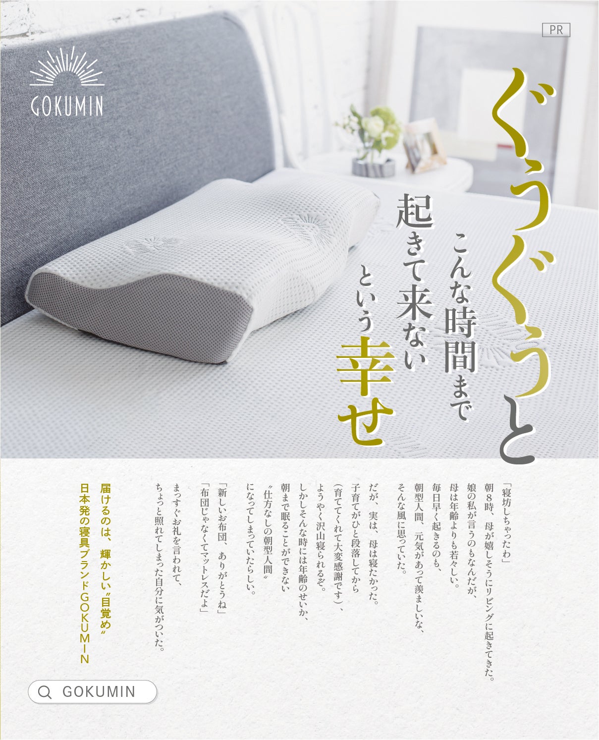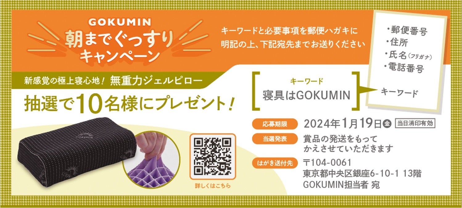寝具ブランドGOKUMINの人気商品「無重力ジェルピロー」が抽選で当たるキャンペーン付き広告です。https://gokumin.co.jp/?mode=f24